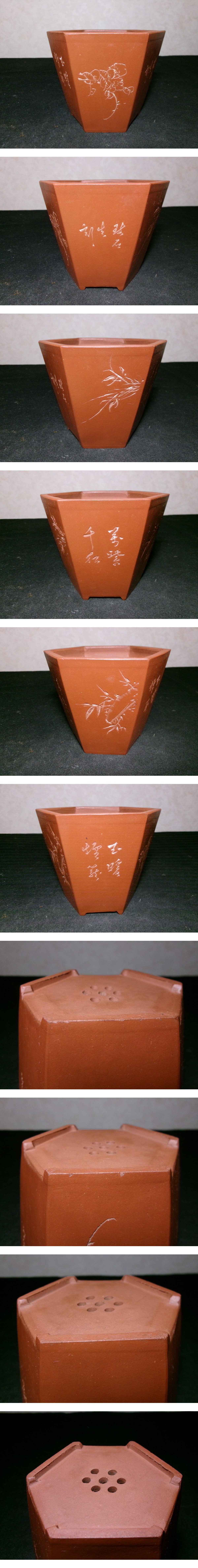 | 超希少 時代感上々 中国古鉢 中国古玩 中国宜興 紫泥草花漢詩彫切足切立六角懸崖小鉢 幅12.4センチ 在銘 時代品 | |||||||||||