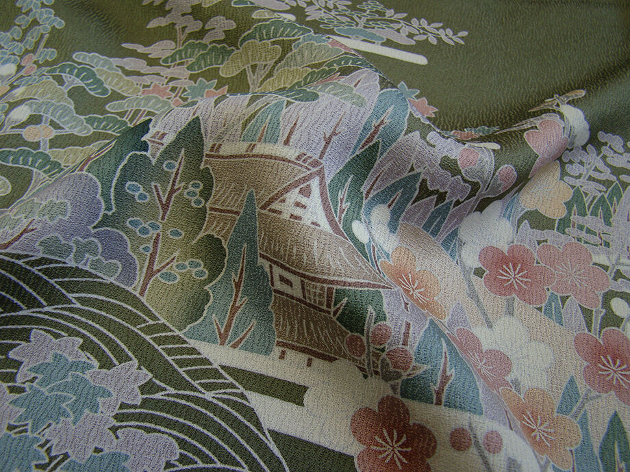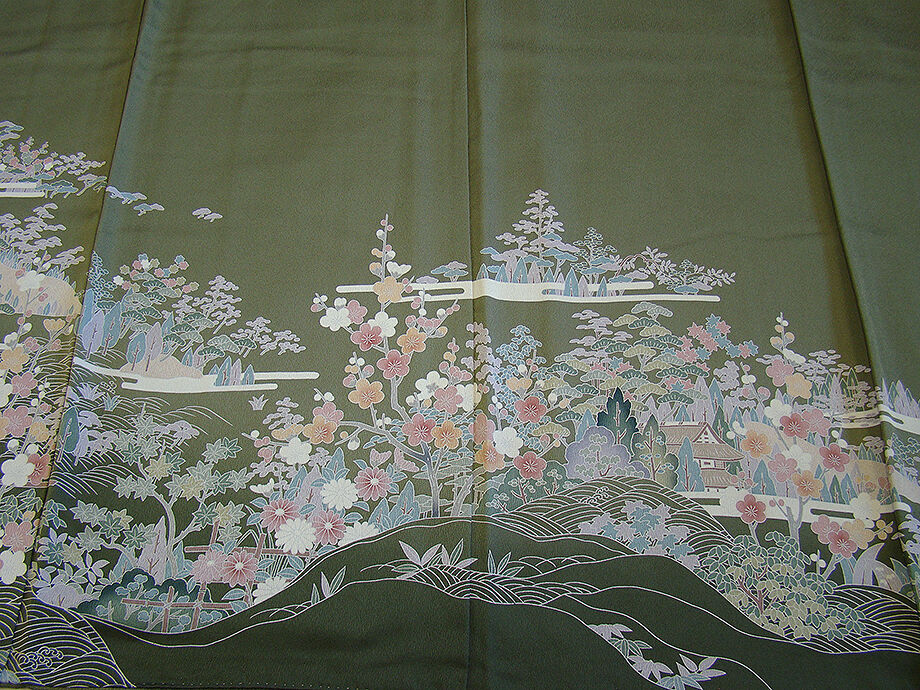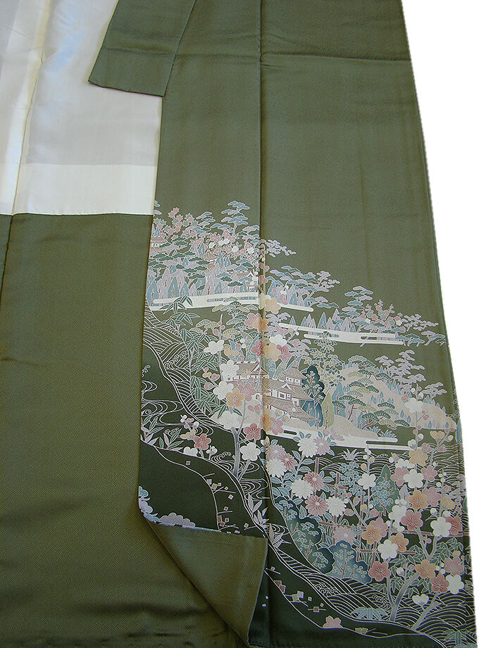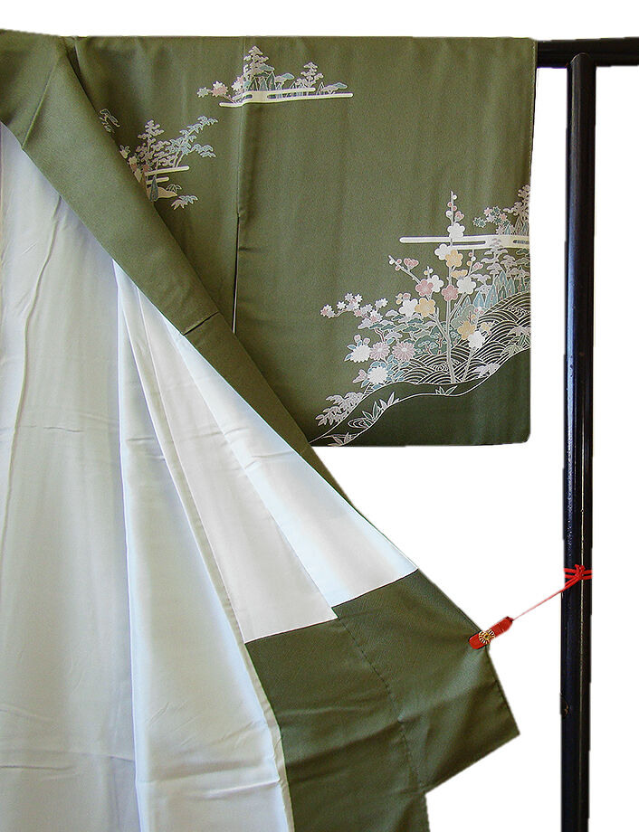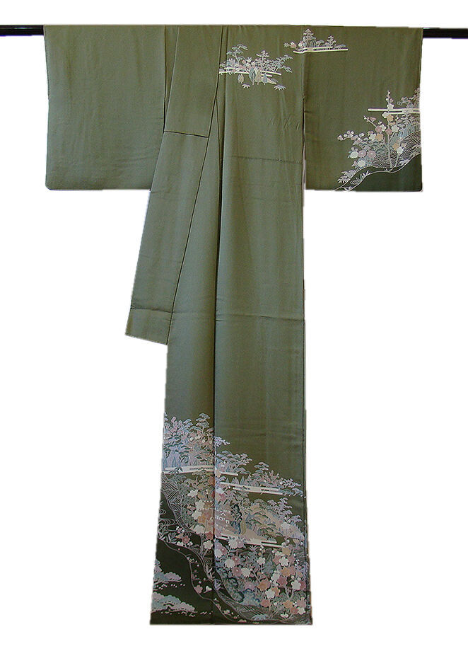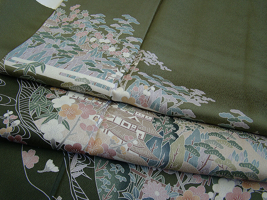 | 商品説明 | こちらのお品は「袷」ですので10月から5月までお召頂ければと思います。 とてもしなやかで柔らかな手触りの滑らかな着心地良い重めの極上ちりめん地の生地、 渋い山鳩色地に裾にかけて濃色ぼかし染に、松竹梅や四季の花木、波、霞、 立木、家屋等の本加工染、 丁寧かつ細やかな染め上がりで、お着物の品格をよりいっそう絢爛たる美しさで満たす事でしょう。 気品に満ち溢れた彩りが正統派のお着物として一枚は欲しい逸品の素敵なお着物です。 また八掛は共色に地模様入りに柄入り(正絹)、幅広い年代の方にお召し頂けます。 |