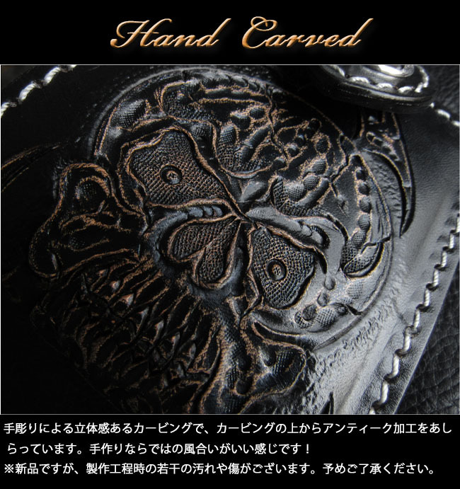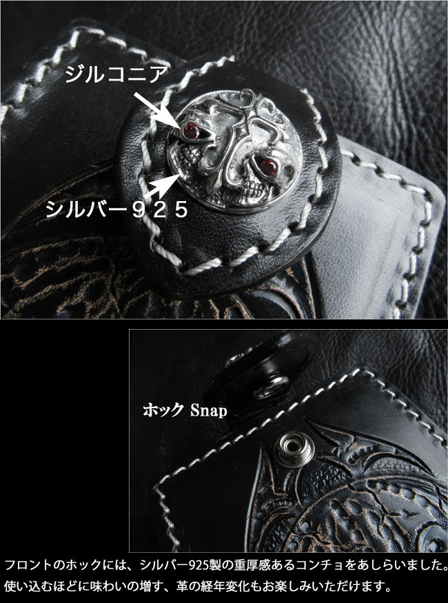 | 商品詳細 髑髏/スカルにトライバル模様をあしらった、遊び心のあるショートウォレット/革財布です。熟練した革職人により1つ1つ手彫でカービングを施しています。 フロントのホックには、シルバー925製の重厚感あるコンチョをあしらい、無骨さと高級感を演出。使い込むほどに味わいを増すレザーの経年変化もお楽しみいただけます。 |
