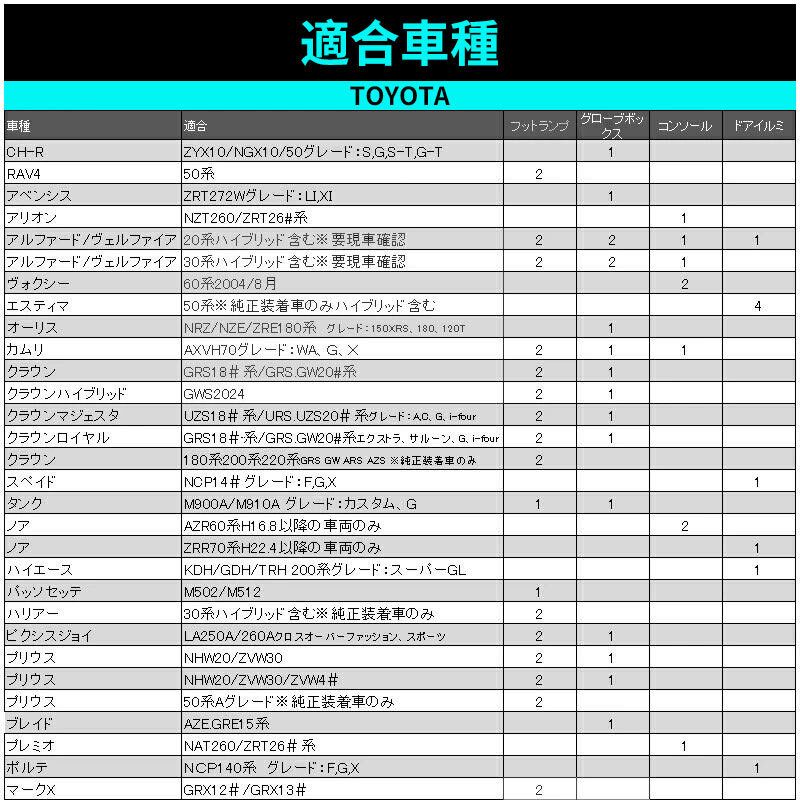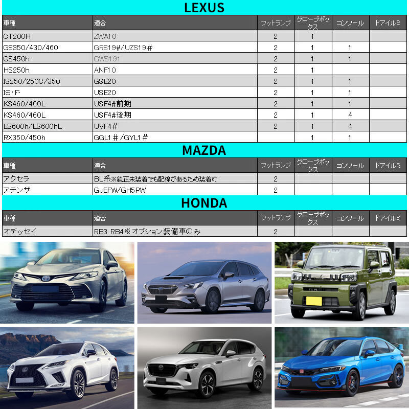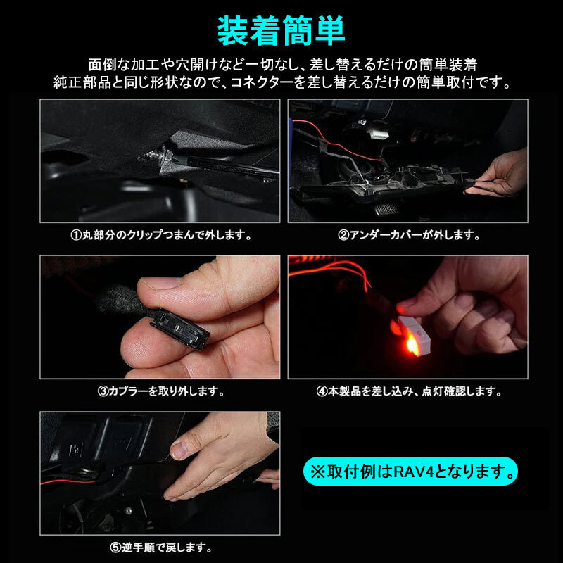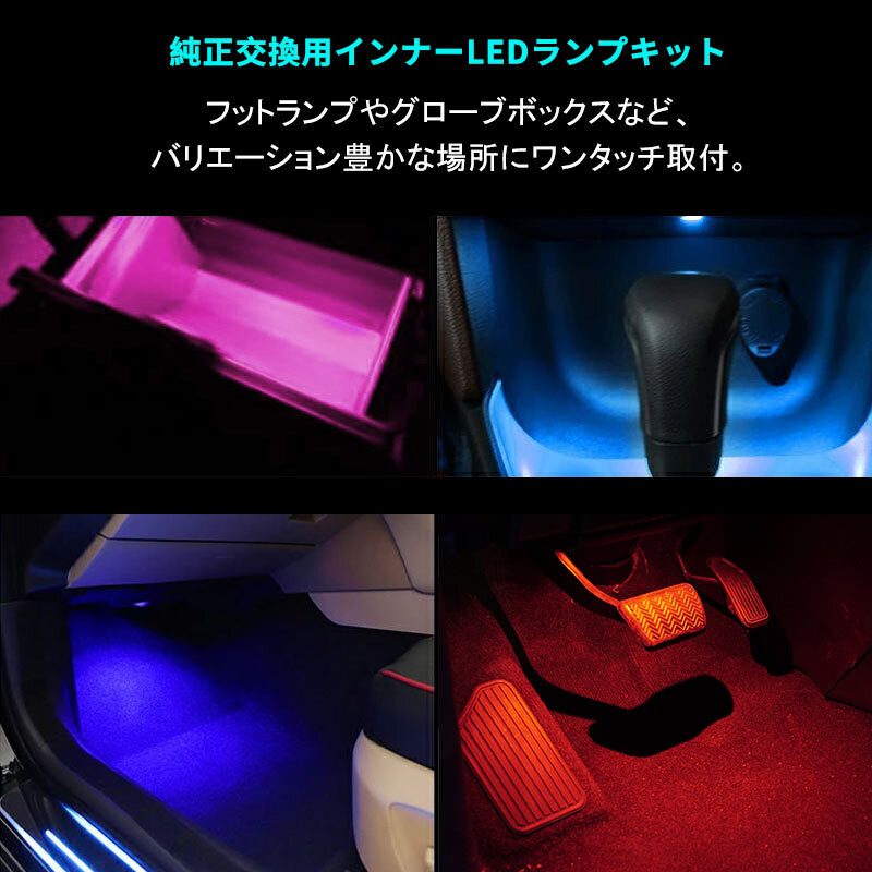| 商品説明 | 足元を照らしながら、車内雰囲気を一変させます! カラフルな5色 純正交換用インナーLEDランプキット 装着簡単: