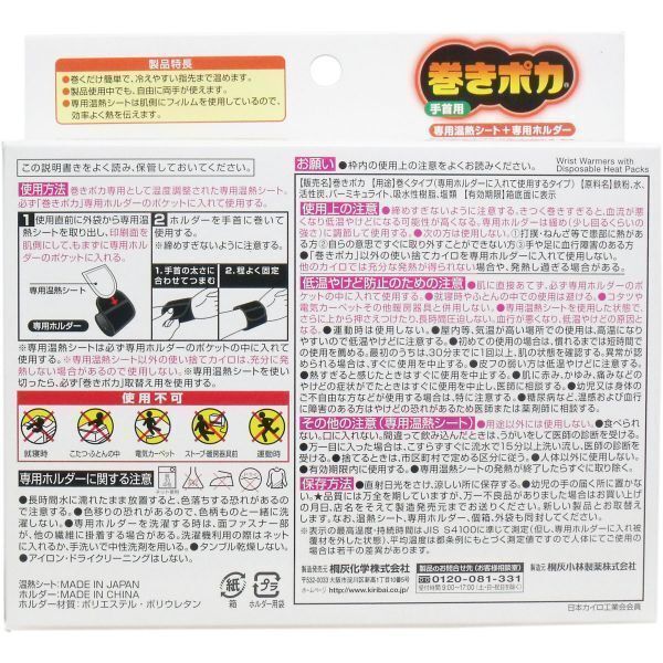手首からぬくもりが拡がります 巻くだけ簡単で冷えやすい手先まで温めます 製品使用中でも自由に両手が使えます 専用温熱シートは肌側にフィルムを使用しているので効率よく熱を伝えます 【商品詳細】 個装サイズ:150mmX140mmX45mm 個装重量:約120g 用途:巻くタイプ(専用ホルダーに入れて使用するタイプ) 原料名:鉄粉、水、活性炭、バーミキュライト、吸水性樹脂、食塩 内容量:【専用ホルダー】:2個、【専用温熱シート】:4個 製造国:【温熱シート】:日本、【ホルダー】:中国 発売元:桐灰化学株式会社 JANコード:4901548252011 【使用方法】 ※巻きポカ専用として温度調整された専用温熱シートです。 必ず「巻きポカ」専用ホルダーのポケットに入れてご使用ください。 (1)使用直前に外袋から専用温熱シートを取り出し、印刷面を肌側にして、 もまずに専用ホルダーのポケットに入れてください。 (2)ホルダーを手首に巻いてご使用ください。※締めすぎないように注意してください。 ※専用温熱シートは必ず専用ホルダーのポケットの中に入れてご使用ください。 ※専用温熱シート以外の使い捨てカイロは、十分に発熱しない場合がありますので使用しないでください。 ※専用温熱シートを使い切ったら、必ず「巻きポカ」取替え用をお買い求めのうえ、ご使用ください。 |