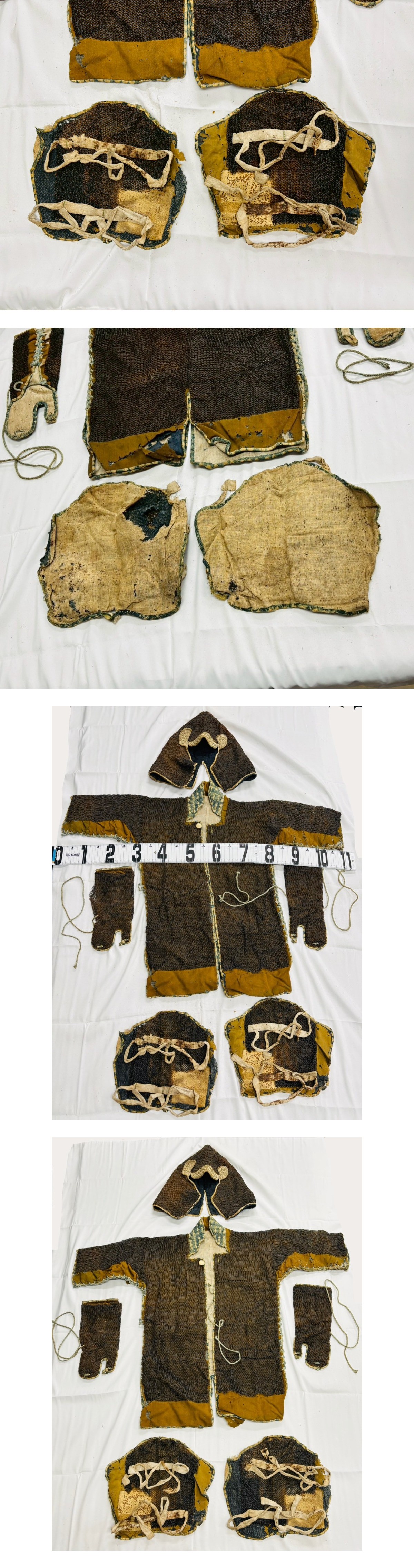 ●【希少 時代物】鎖帷子 一式 頭巾 胴着 手甲 脚絆 武具 甲冑 武士具 江戸期 鉄製 鎖かたびら 骨董品 飾物 時代物 古武具 長崎買取 現状 ■頭サイズ:横幅 43cm/縦幅 42cm ■胴サイズ:横幅 110cm/縦幅 85cm ■手サイズ:横幅 14.5cm/縦幅 31cm ■足サイズ:横幅 30cm/縦幅 30cm ※素人寸法の為、若干の誤差はご了承ください。 ■状態につきましては経年に伴うスレ・汚れ・小キズ などが見られます。 ※その他の細かな状態は写真にてご確認・ご了承の上 ご入札くださいませ。 ●こちらの商品などは時代物や古いお品・骨董品となり ますので、細かな状態を気にされる方・神経質な方の ご入札はご遠慮くださいませ。 |