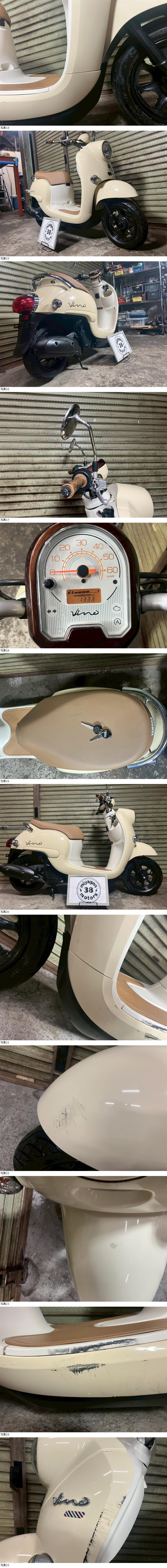 | 商品説明 | この度は当出品車両をご覧頂きまして誠に有難う御座います。 他にも複数台出品がございますので宜しければご覧ください! ご入札頂けた際には文末にありますお取引詳細にご同意頂けたものとさせて頂きます。 下記車両詳細・お取引詳細になりますので必ずご一読くださいませ! また、直接お越しいただいた方にその場で販売することもあるため予告なしに出品の取り消し等をする場合も御座います。 よって、落札前には一言コメント欄にてご一報頂けますと幸いです。予めご了承下さい。 〜〜車両詳細〜〜 メーカー:ヤマハ 車種:VINO 1オーナー 年式:2021年 色:ベージュ 鍵:純正キー2本 排気量:50cc 走行距離:1,333km 燃料供給装置:インジェクション フレームNo:AY02-1119XXX 自賠責:なし 自賠責の加入も可能です! * * * 高年式低走行な1オーナーVINO入荷いたしました☆ ・外観 一部擦り傷ありますがそれ以外は艶もあり好印象です♪ 状態は写真にてご確認ください。 ・エンジンセルにて始動O K! 吹け上がり良好! 確認箇所は以下となります。 スピードメーター:作動OK! ヘッドライト:ハイロー点灯! ウィンカー:前後左右点灯! テール:尾灯・ブレーキ共に点灯! ナンバー灯:点灯! ホーン:作動OK! ★別途部品交換受け付けます! ・タイヤ前後交換など!詳細は直接お問い合わせくださいませ! エンジンオイル・タイヤ交換など! 詳細は直接お問い合わせくださいませ! *上記ご利用の際は部品の在庫状況によりお引き渡しまでにお時間を頂戴する場合が御座います。 〜〜お取引詳細〜〜 ※ご注意ください※ 出品車両はあくまで現状販売となります。走行点検などは行っておりません。 良好・好印象などの表記に関しても車両の状態を確実に保証するものではなく 細かい程度の差なども含めあくまで当方の主観でありますこと重々ご承知置き下さい。 特別に気になる箇所など(外観に限ります)がある場合は直接ご相談ください。 ご指定いただきました箇所のお写真を添付をさせていただきます。 (あまりにも多い場合はご対応致しかねます。) 上記を踏まえまして現車の確認は大歓迎です。 細かい箇所など気になる方は是非とも現車確認を行ってください! (予約制となりますので直接お問い合わせください。) 一般の二輪販売店と同様の点検・整備は行っておりません。 車両に関する一切の保証等も御座いませんので自走でのお引き取りはお断り致します。 ある程度の知識があり落札後にご自身で整備の出来る方、或いは整備工場等にて分解整備を別途検討できる方、メンテナンスベースとしての使用などの落札を推奨しております。 明記してあること以外の確認はしておらず、また致しかねます。 目視できる消耗品以外のパーツに関しましても寿命のわからぬものなど御座います。 (中古品ですのでつい先程まで正常に作動していたにも関わらずお受け取りの際に状態の変化などある場合も十分御座います。例・電子機器、ワイヤー類など) 再三にはなりますが如何なる場合もお引き渡し後のキャンセル・クレームはお受け致しかねます。 現状販売というものを重々ご理解の上ノークレーム・ノーリターンでよろしくお願い致します。 原則キャンセルはお受け致しかねますが、止むを得ず落札者様都合でキャンセルされる場合には 落札金額の1割をキャンセル費用として頂戴させて頂きます。 上記取引内容に不安を感じられる方には二輪販売店等の整備・保証付き車両のご購入を強くお勧め致します。 ★直接引き取り・即引き取り大歓迎! 直接引き取りの場合、落札から1週間以内にお引き取り下さい。 それ以降日割りにて2,200円を別途頂戴させて頂きます。 *部品交換をご依頼の方は完成のご連絡から1週間以内となります。 ★配送OK! 主に配送業者に委託しております。ご自身で手配いただいても結構です。 レッドラインの金額を参考にしておりますのでお手数ですが費用に関しましては落札者様にて直接HPでご確認下さい。 発送元は埼玉県川口市となります。ご購入から配送までの目安は関東近郊で1〜2週間程度となるかと思います。(地域、期間により大幅に異なりますので納期が気になる方は直接レッドラインへお問い合わせ下さい。) 関東近郊の場合割増でお早めにお届けできる場合も御座いますので一度ご相談下さいませ!(対象外となる場合も御座います。) また、配送の場合もお取置き等の対応は致しかねますので落札後は速やかに配送依頼の手続きを行わせて頂きます。 ★車両のみの販売となりますので必要な場合のみ別途5,500円にて販売証明書の発行・発送を受け賜ります! ★新規アカウントの方、落札者様の評価内容によりましては、ご入札頂いても当方の判断で削除する場合がございます。予めご了承下さい。 ★落札後、24時間以内にお客様情報のご入力・落札代金のお支払いがいただけない方のお取引はキャンセルとさせていただきます。(お支払いに関しましては、どうしてもの場合大幅な期間でなければある程度ご相談にのら