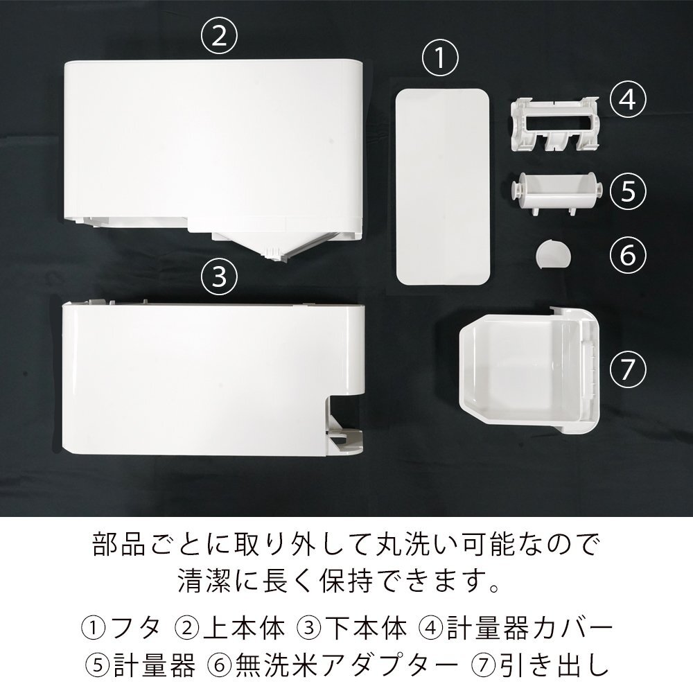 | 材質 | 【上下本体・止め具・キャスター・計量器カバー・引き出し】 ポリプロピレン 【フタ・フタ枠・底板・計量器・レバー・ストッパー・無洗米アダプター】 ポリスチレン 【透明窓】 AS樹脂 【パッキン】 シリコーンゴム 【クッション】 ポリエチレン 【脚ゴム】 ポリエチレン |
