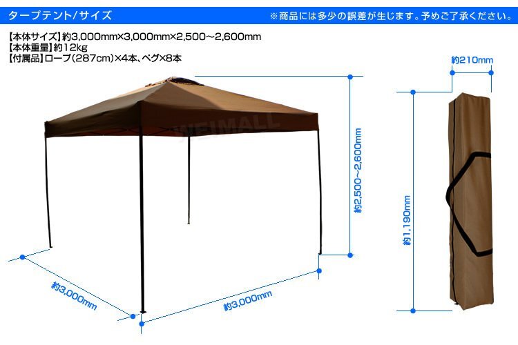 強い日差しでもこの3m×3mのタープテントは快適な日陰を作ってくれます! アウトドア、運動会、その他イベントなどに! 組み立てはワンタッチ! 他にもこだわり機能がたくさん♪ 【商品仕様】 カラー:ブルー サイズ(約): ・使用時:幅300×奥行300×高さ250/260cm ・収納時:幅120×奥行20×高さ20cm 材質:スチール、ポリエステル 重量(約):11kg 【セット内容]】※1台あたりのセット内容です。 タープテント本体 ロープ ×4 ペグ ×8 専用収納ケース ※注意事項 ・生地には撥水加工が施されていますが、雨天・豪雨下での完全防水を保証するものではございません。 ・風速5m以上の風の吹く場所でのご使用は、転倒や破損の原因になります。 ・設営の際は、2人以上で丁寧に作業を行いしっかりと固定してください。 |