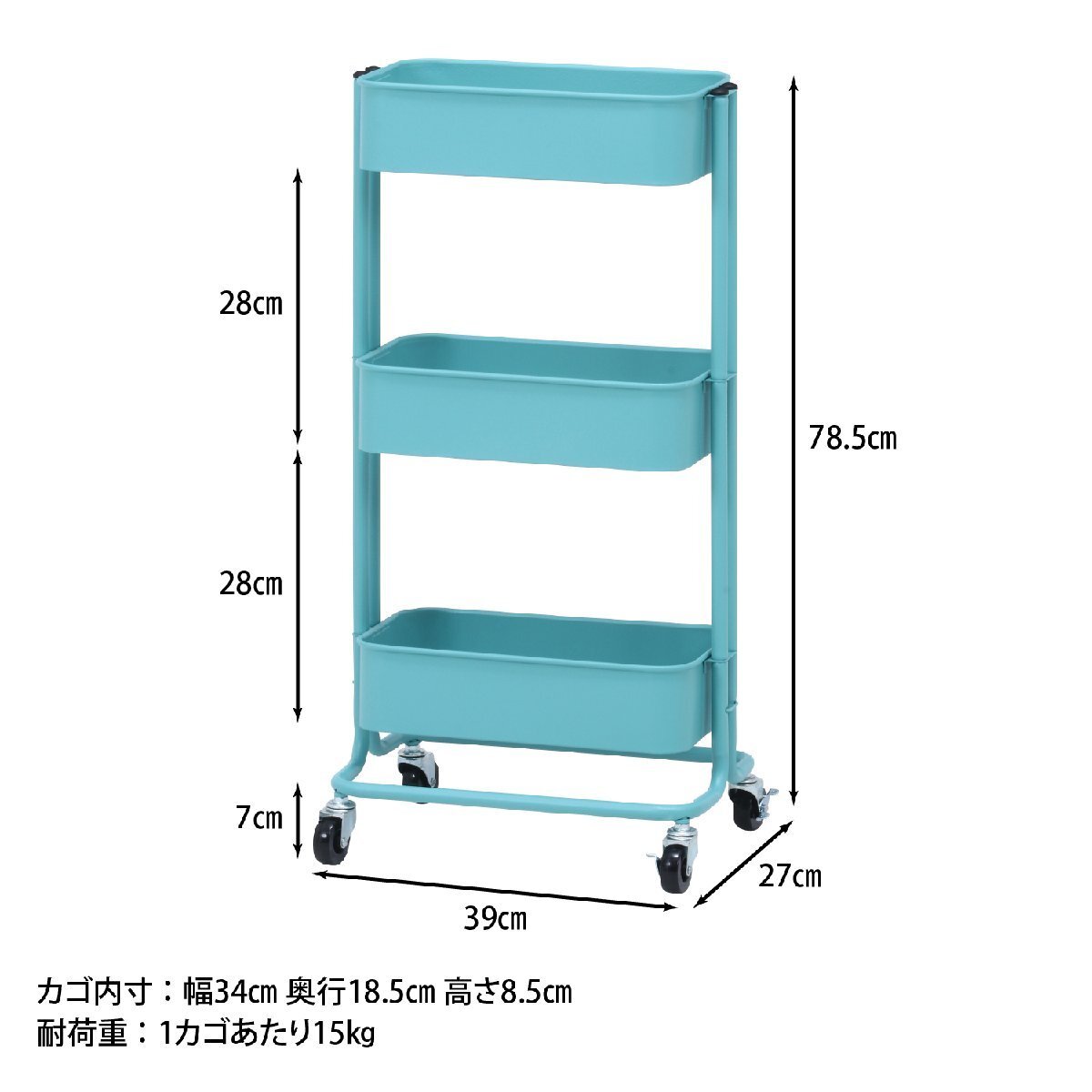 | サイズ | 全体:幅390 × 奥行270 × 高さ785mm 耐荷重(カゴ):15kg カゴ内寸:340x185x85mm ※サイズ詳細はサイズ画像をご参照ください。 |