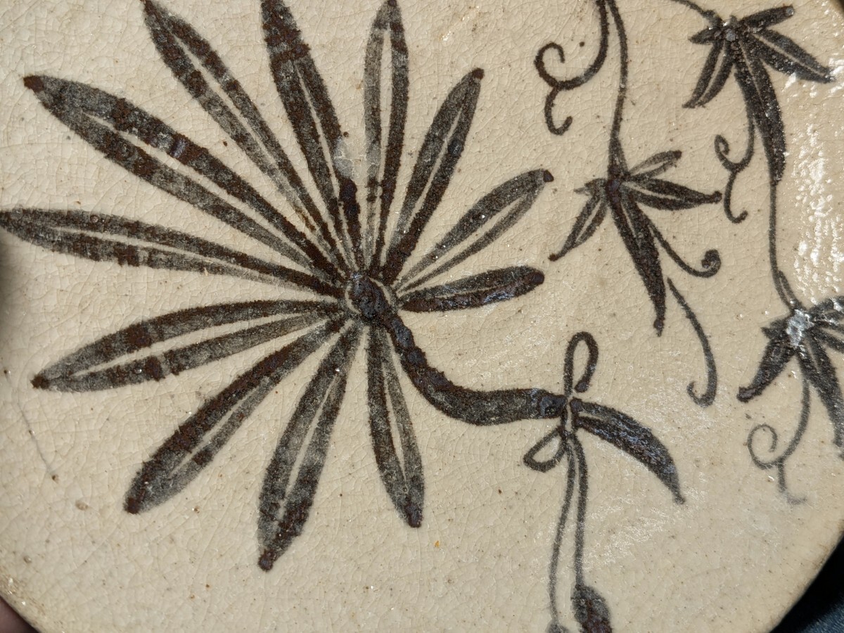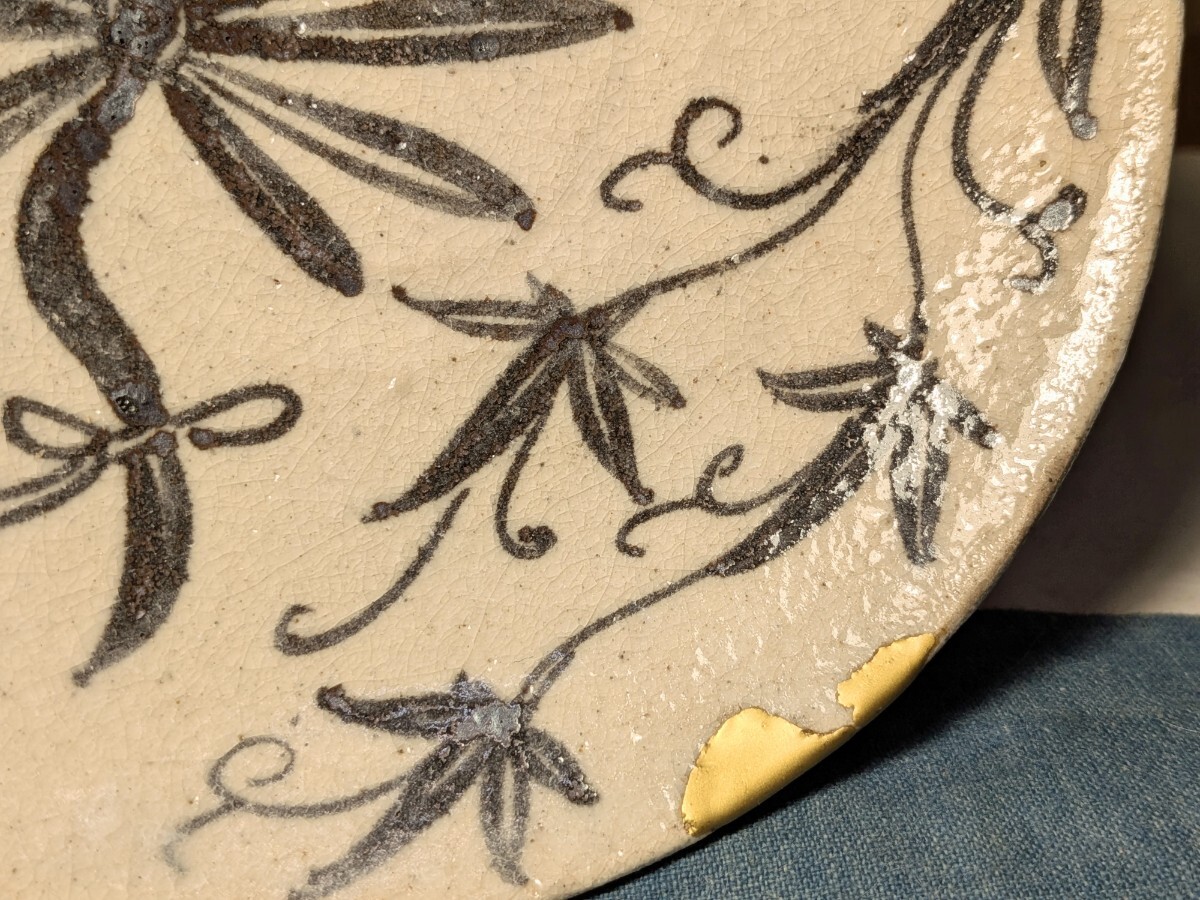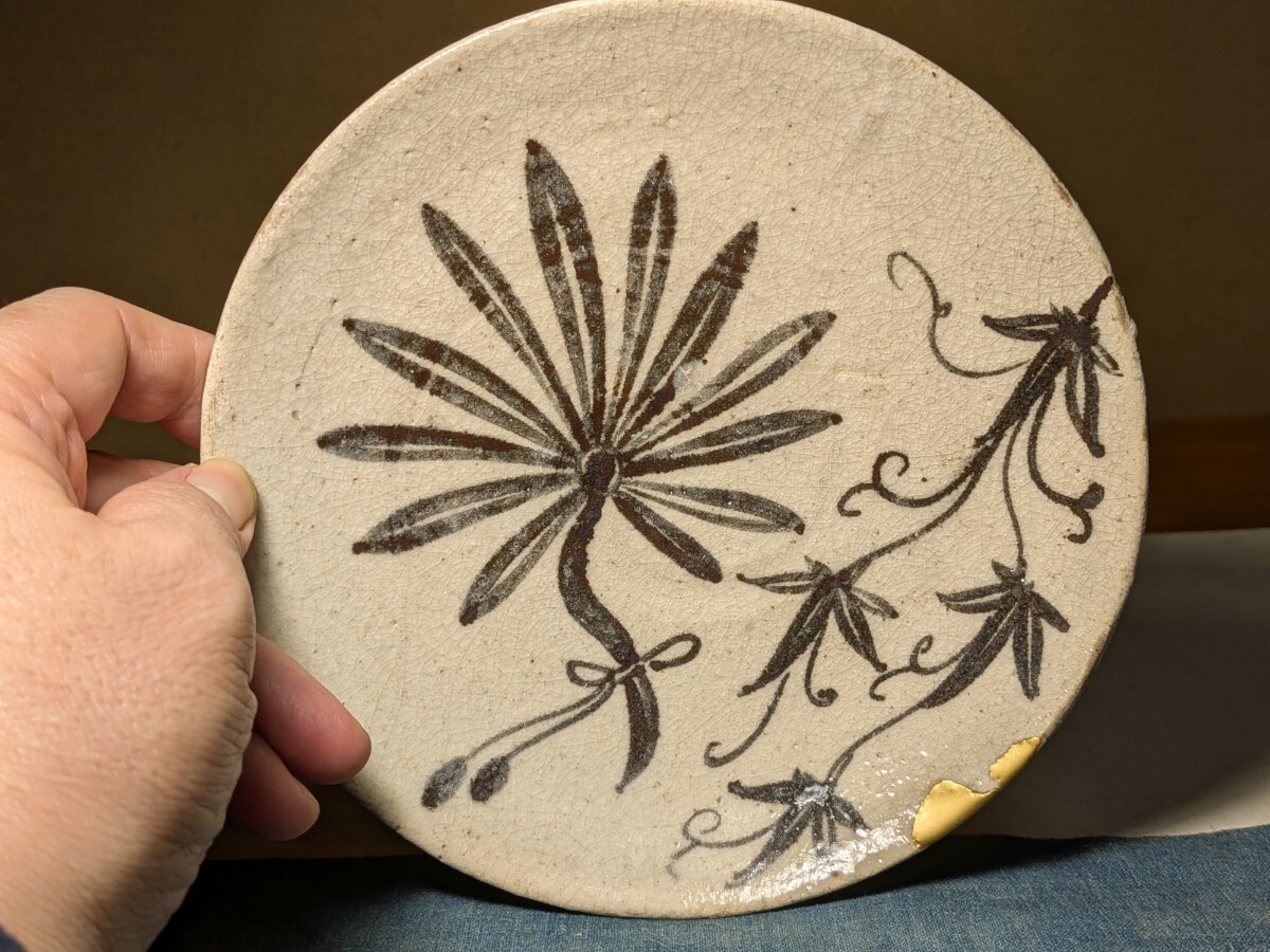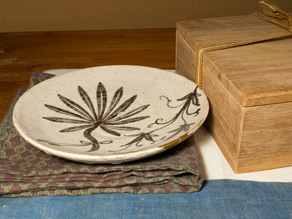 志野織部の八つ手文に蔦文を加えた中皿です。しっとりとした肌の伝世品です。伸びやかで力強い絵付けで志野織部を代表する図柄の1つです。縁にほぼつながったほつれの金直しがあります。実用はもちろんですが飾り皿として日々楽しんでいただきたい大変飾り映えのする志野織部八つ手文中皿を特別出品です。箱あり。・口径16.5〜16.6センチ・高さ3.3〜3.6センチ・桃山時代 ※新規の方、評価の悪い方の入札は取り消す場合があります。商品到着後は速やかに取引ナビの受取連絡を入れて下さい。