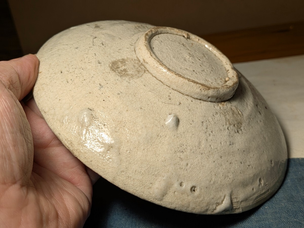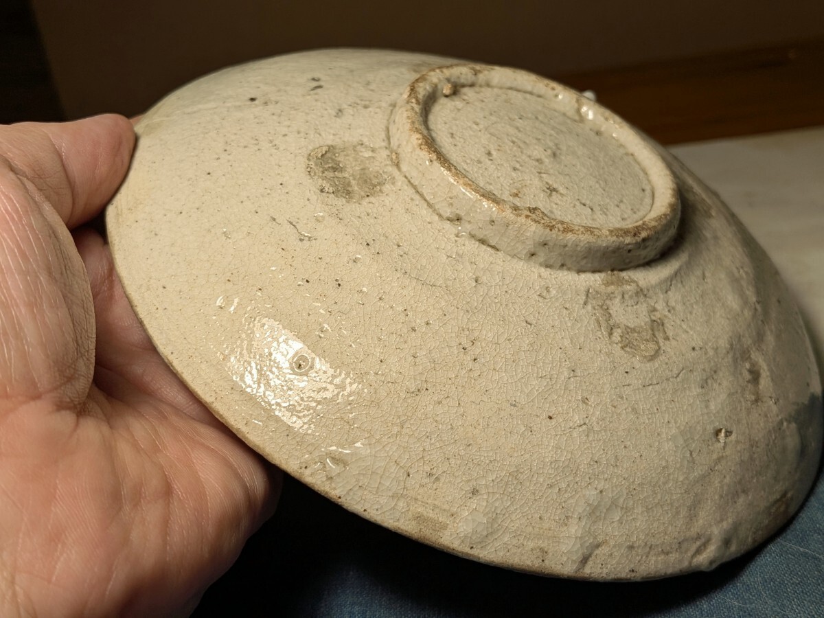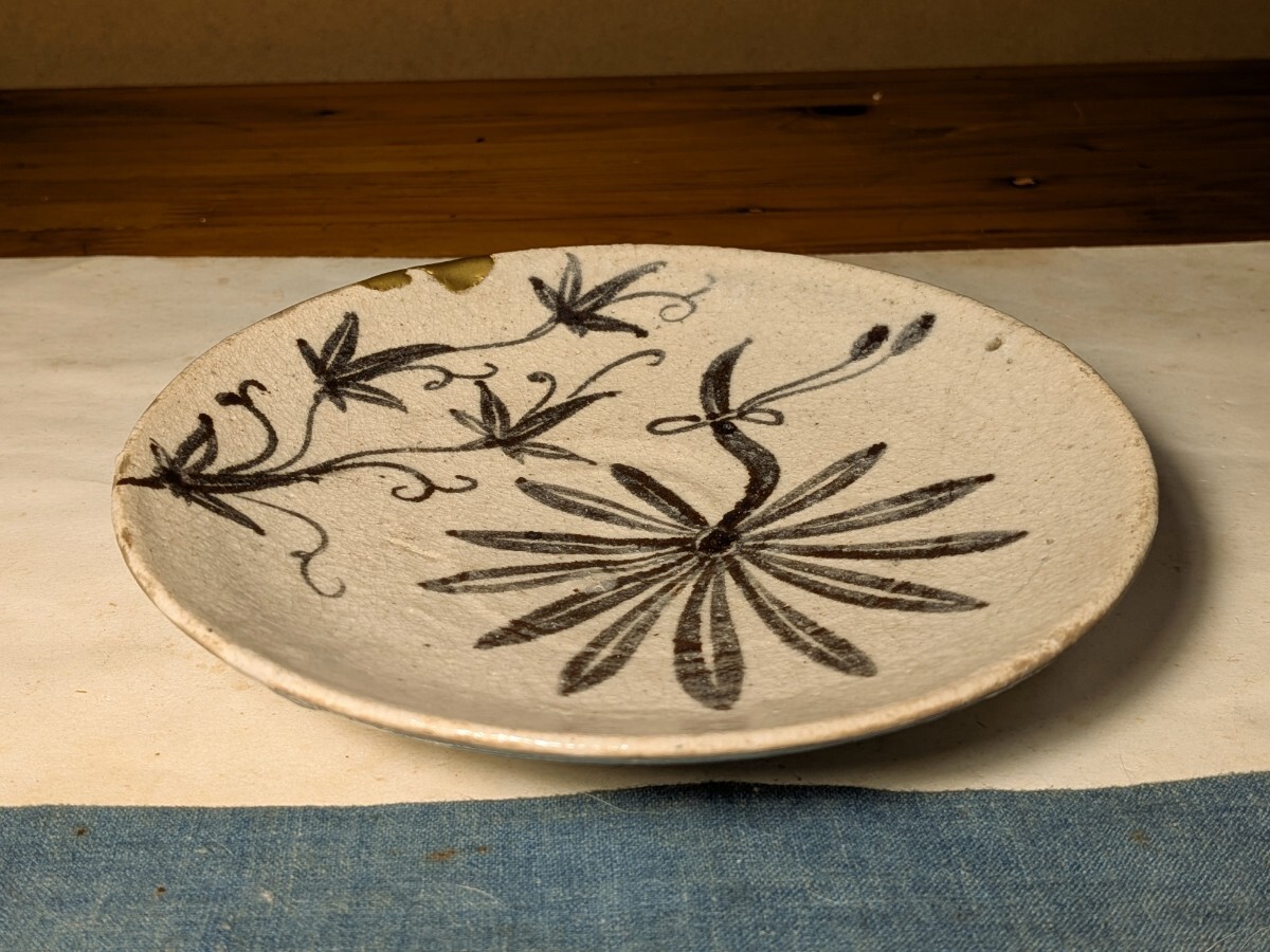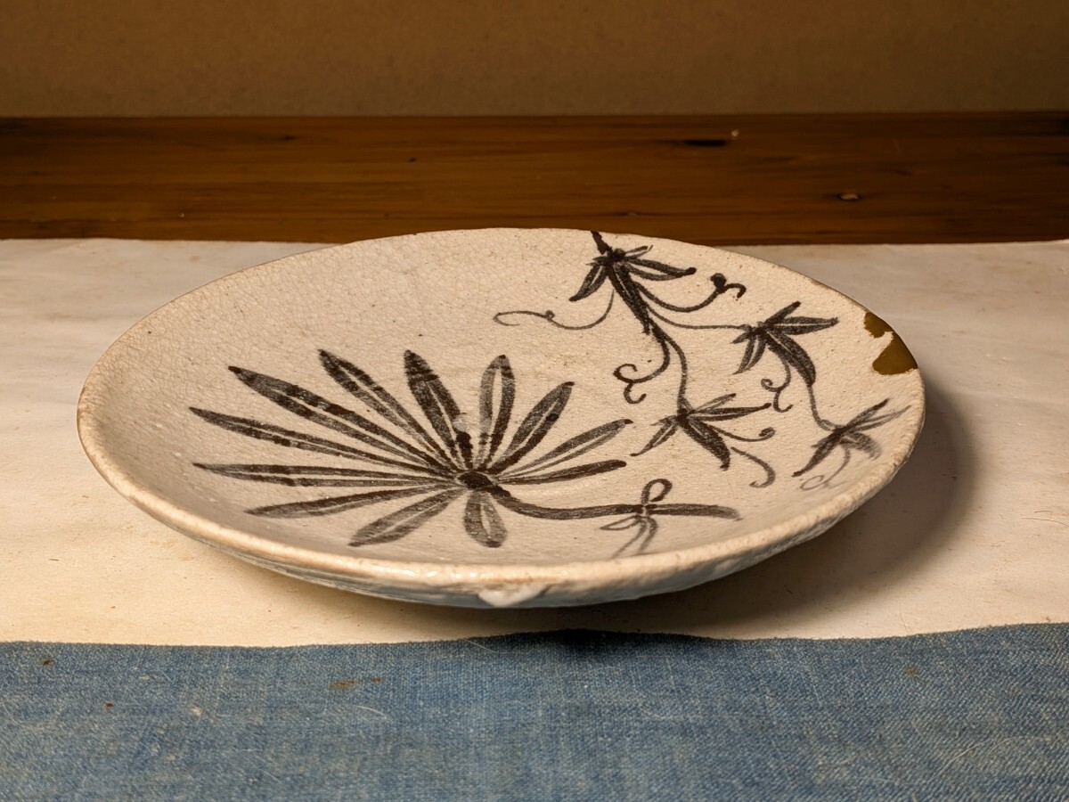志野織部の八つ手文に蔦文を加えた中皿です。しっとりとした肌の伝世品です。伸びやかで力強い絵付けで志野織部を代表する図柄の1つです。縁にほぼつながったほつれの金直しがあります。実用はもちろんですが飾り皿として日々楽しんでいただきたい大変飾り映えのする志野織部八つ手文中皿を特別出品です。箱あり。・口径16.5〜16.6センチ・高さ3.3〜3.6センチ・桃山時代 ※新規の方、評価の悪い方の入札は取り消す場合があります。商品到着後は速やかに取引ナビの受取連絡を入れて下さい。