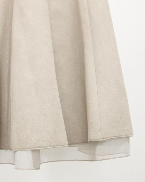 | ふんわりと広がるフェミニンスカート♪裾から覗くシフォンがさりげなく、ふんわりと広がるフレアで女性らしい雰囲気を演出するスカートです。スウェード調の素材が温もりある風合いです。シンプルなデザインなので、どんなトップスとも◎ |