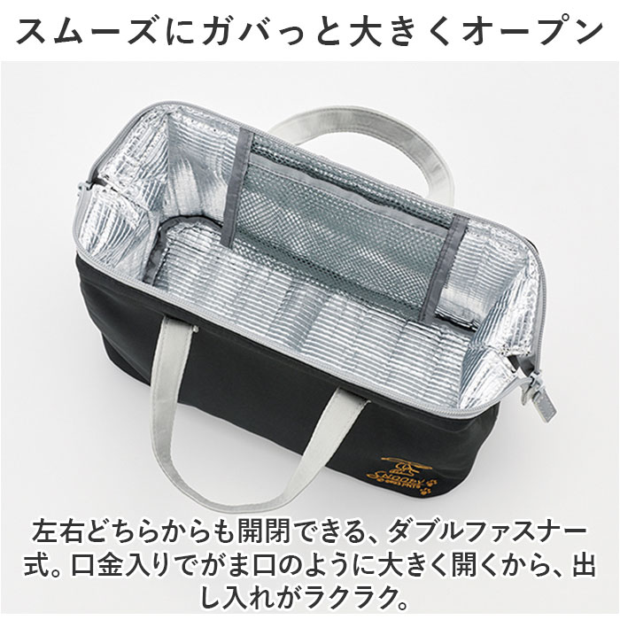 | 商品説明 | ・・うれしい広口設計!2段のお弁当箱もすっきり収まる「がま口型ランチバッグ」大きめサイズが新登場。 ・【手軽に持ち出せるランチバッグ】 ・サッと手に取れる軽量設計。家族みんなのランチのお供にぴったり! ・【スムーズにガバっと大きくオープン】 ・左右どちらからも開閉できる、ダブルファスナー式。口金入りでがま口のように大きく開くから、出し入れがラクラク。 ・【大きめの2段お弁当箱がすっぽりIN】 ・マチや幅を設けた長方形フォルム。たっぷりサイズや2段のお弁当箱も収納OK。 ・【オールシーズン活躍!保冷保温仕様】 ・内側は保冷・保温効果のあるアルミ蒸着フィルム仕様。ファスナーを閉じれば冷気などを逃しにくい! ・【保冷剤を入れて保冷効果アップ】 ・保冷剤が入るメッシュポケット付き。保冷効果が高まり、食材の傷み予防に。 ・【生鮮食品のエコバッグとしても重宝】 ・お買い物時には、冷蔵・冷凍食品を入れて持ち帰り◎ ・【年代問わず使いやすいデザイン】 ・男性も女性も使いやすいデザイン。通勤・通学に便利。 |
