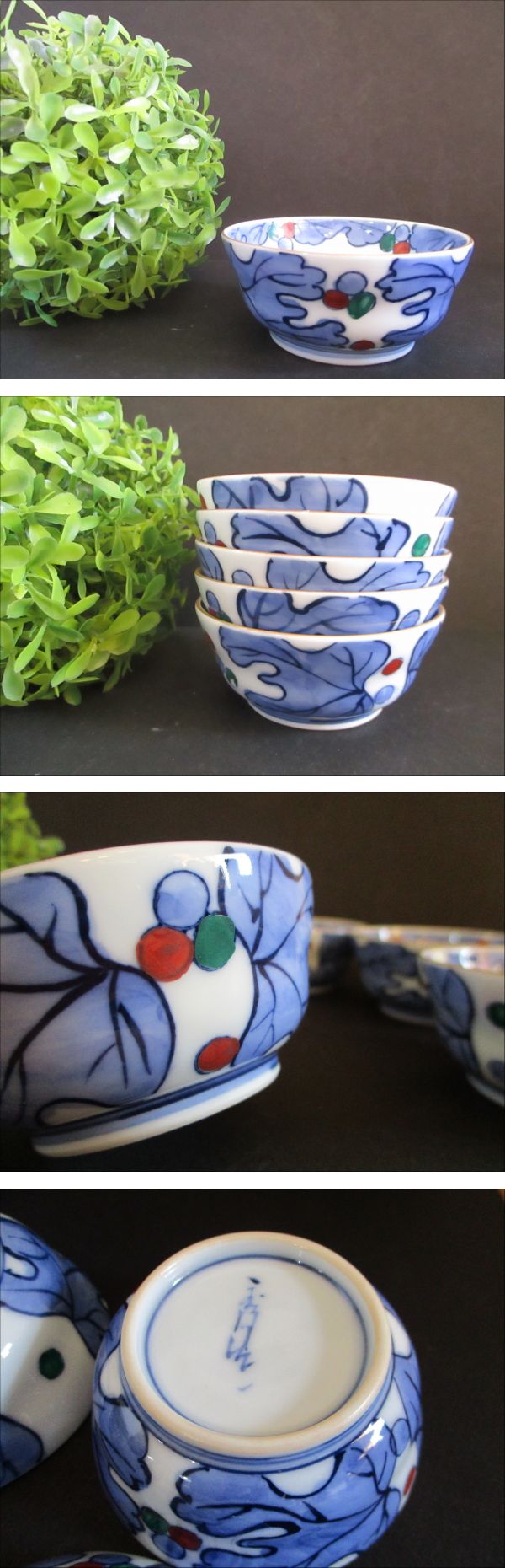 【レア・希少】小鉢 5個セット 在銘あり 陶器 染付 手描き?アクセントカラー 伝統工芸品 ビンテージ 一品料理 一口サイズ 器 小皿 和食器 | |||