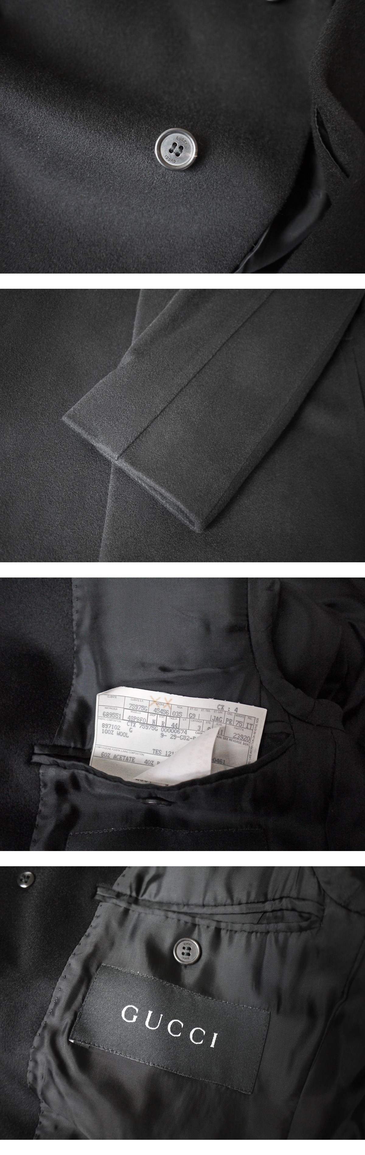 イタリアトップメゾンの名に恥じない最高峰のクオリティで、一生もののコートとしておすすめさせて頂きます。この機会にぜひよろしくお願いいたします。 brand GUCCI made in Italy price \385,000 material wool 100% color Black size 44 肩幅44 着丈88 袖丈65 身幅51 (多少の誤差はご了承ください。) 状態 使用感のあまり感じられない美品となります。裏地含めダメージは見受けられず末永くご使用頂ける状態です。 |