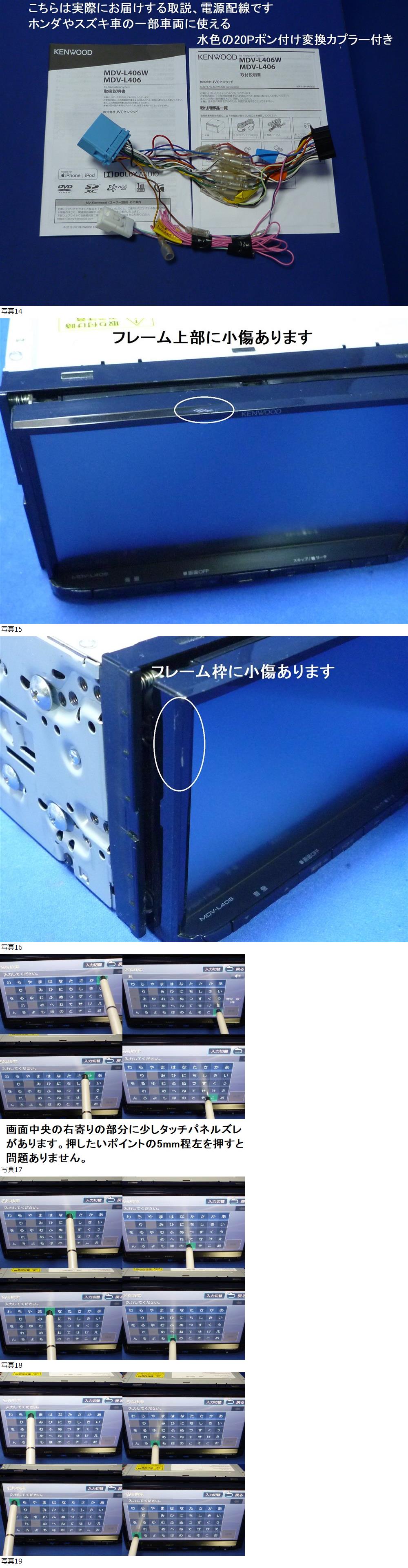 | 商品紹介 | ★★★地図データ最新版に更新済★★★ 地図データ 最新版・2025年秋9月リリース版(2025年01版) ファームウェア 最新版(4.0.4619.5600) 開通予定情報 最新版(2026年第01月版) メモリーナビ SDナビ KENWOOD ケンウッド MDV-L406 シリアルNO.104X1567 2019年製 外形寸法(W) x (H) x (D)180mm x 100mm x 183mm 埋込寸法(W) x (H) x (D)178mm x 100mm x 160mm 主な特長 「高画質」と「高速レスポンス」を追求する彩速テクノロジー シンプルでスマートなGUI。 はじめての方にもわかりやすいカンタン「彩速ナビ」。 安心・安全をタイムリーにサポート。 万が一の時に備えた新機能で安心ドライブ。 ドライバーの気持ちに寄り添うフレンドリーな新機能がラインアップ 高精細な録画と安心・安全なドライブのために 高解像度3M(メガ)〈2304×1296〉録画を実現 専用ドライブレコーダー連携対応 快適なドライブを演出する多彩なAV機能 スマートフォンの地図とナビが連携する。 取り外すまで問題なく使用出来ていた物になります。 出品に辺り、卓上電源にて下記動作確認・写真撮影しております。 (写真は一部流用してます) 写真2枚目~8枚目と下記写真はお届けするナビの現物写真です。 ボタン部分の文字剥げもなく綺麗な方だと思います♪ 液晶画面、多少薄い線はありますが 比較的綺麗な方だと思います♪ ※画面の一部に少しタッチパネルズレがあります。 (画面中央の右寄り部分) 押したいポイントのやや左5mm程を押すと良いです。 フレーム枠に小傷あります。 通常よりお安く価格設定しております。 ・ナビ基本操作:OK(一部少しタッチパネルズレ有) ・地デジワンセグTV視聴:OK ・USB、音楽ファイル再生:OK ・iPhoneケーブルでUSB接続、iphone音楽ファイル再生:OK ・SDカード、音楽ファイル再生:OK ・DVD再生:OK ・CD再生:OK ・GPS受信:OK ・スピーカーからの音出し:OK ・ラジオ受信:OK ・パネル開閉/角度調整:OK ・ユーザー設定の初期化:済み お届けは下記になります。 カーナビ本体、 電源配線(走行中にDVD、TVが見れるような配線加工されてました)、 ホンダやスズキ車の一部車両に使える水色の20Pポン付け変換カプラー付き、 GPSアンテナ、 ワンセグ地デジアンテナコード(エレメント接続部分も問題ありません)×1、 新品フィルムアンテナ(両面テープ付き)×1、 USBコード(本体直付け)、 取扱説明書、 取付説明書、 になります。 本体背面に・・・ 専用リアビューカメラ入力(汎用カメラの場合は別途CA-C100が必要)や、 ドライブレコーダー(DRV-N530)からの映像入力、 車両アンテナからの入力、等が有ります♪ ドラレコとの連携にはETCステアリングリモコンケーブル(KNA-300EX)が必要です。 詳しくは下記の取付説明書の方をご覧下さい。 ナビ製品詳細ページ ←クリックしてご覧頂けます 主な定格 ←クリックしてご覧頂けます 取扱説明書 ←クリックしてご覧頂けます 取付説明書 ←クリックしてご覧頂けます 比較的綺麗な方だと思いますが、こちらは中古品になりますので、年相応の使用感や小傷、汚れ等ございます。 出品に辺り写真に写っている動作確認は確認出来ておりますが 短時間での確認となり、その他全ての動作確認を出来ている訳ではございません。 保証は有りませんので、その点ご了承の上、ご入札願います。 また電源配線など、途中でカットしている場合もございますし、 加工している場合もございます。 必要に応じて、取付の際、加工が必要な事もございます。 配線コード関係はビニールテープ等の粘着が残っている場合もございます。 ツメ等もカケが有るかもしれません。 いずれも動作には支障ありませんし、取付業者は手慣れている事だと思います。 配線、コード関係はあくまでおまけとお考え頂き ご理解の上、ご入札願います。 取付方法、ご使用方法によって破損、故障する場合も有りますし、 同商品の一部差し替えによる返品防止の為、 ご返品、ご返金は一切出来かねます。何卒ご理解願います。 万一、運送トラブル等で破損の際は、運送保険にてご対応願います。 ------------------------------------------------- 送料一律1500円 (北海道、沖縄は送料2500円になります) お支払は落札価格+送料になります。 当方お休みを除き14時までにかんたん決済受付確認出来ましたら 即日発送致します。 |