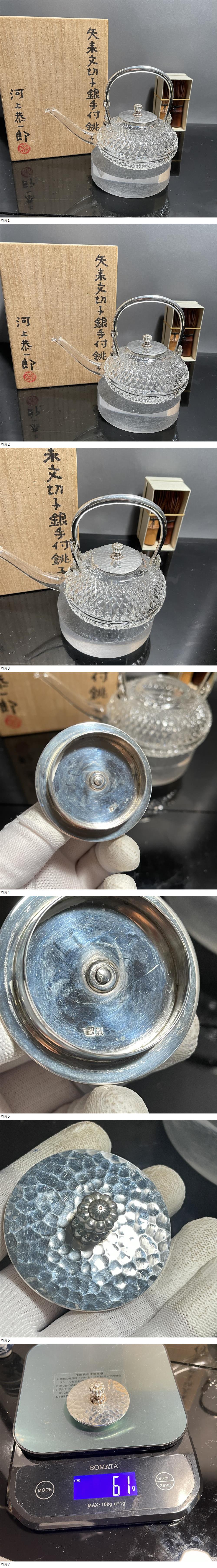 | 【C90】矢来文切子 銀手付 銚子 水注 河上恭一郎書箱 銀製在銘 銀製部分約120g 注子 茶器 茶道具 煎茶道具 日本美術 |