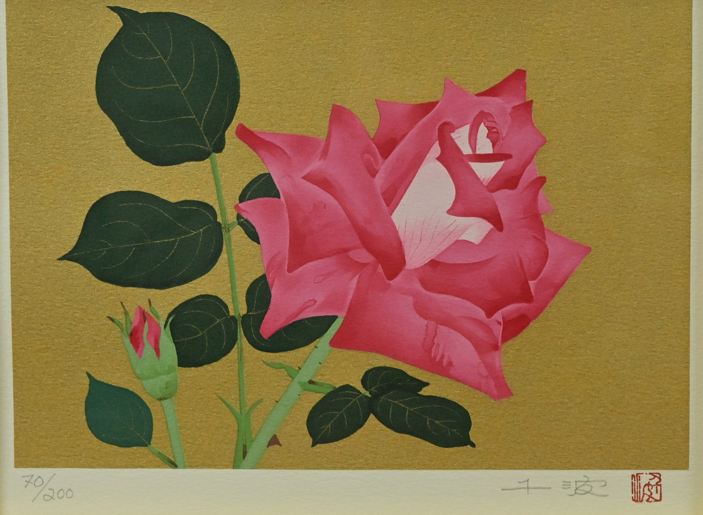 | ご覧いただきありがとうございます。 ・寸法 全長 約39.5cm×45.5cm 作品 約 18cm×24cm ・状態 額装に多少スレ。 | |