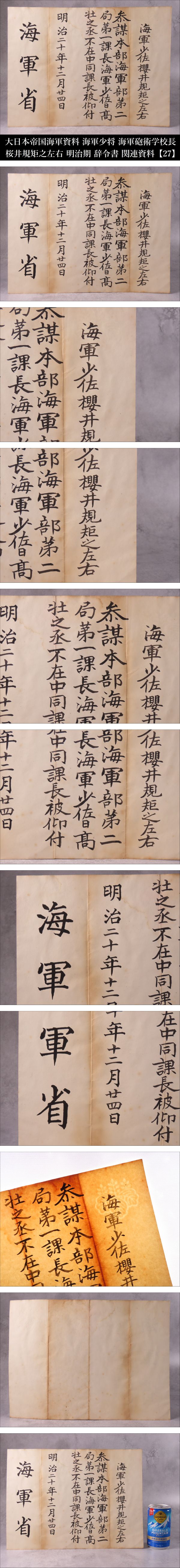 | Lot.20260423HA251129OSX/10 ※ご入札いただいた時点で下記記載事項全てにご了承いただいたものとさせていただきます。 ※商品タイトルは当方判断に基づき記載しております。また単にキーワードとして記載している場合もございますので予めご了承ください。 【ONE'S】大日本帝国海軍資料 海軍少佐 海軍砲術学校長 桜井規矩之左右 明治期 辞令書 関連資料 海軍省 明治二十年十二月二四日 【27】 桜井 規矩之左右(さくらゐ きくのすけ) 嘉永元年6月6日(1848年7月6日) - 大正元年(1912年11月27日)64歳没 日本の武士、大日本帝国海軍の軍人。海軍兵学校3期。最終階級は海軍少将。 海軍砲術学校長、巡洋艦「比叡」「松島」「千歳」「橋立」の艦長を歴任。 日清戦争において比叡艦長として特に黄海海戦で功績を残しました。 彼の貢献は日本の海軍史において重要な位置を占めています。 《幕末の佐倉藩に生まれ、海軍の礎を築いた「海の侍」。日清戦争・黄海海戦にて、絶望を希望に変えた奇跡の突撃。敵の巨大戦艦に包囲され、沈没か降伏かの絶体絶命の淵に立たされた軍艦「比叡」。その極限状態の中、桜井は「敵陣中央突破」という戦術の常識を超えた決断を下した。炎の中を突き抜けたその一閃は劣勢だった日本海軍を奮い立たせ、日本の運命を変えた伝説の男。》 なかなかお目にかかることのないお品物をこの一期一会のご機会にぜひ。 【商品状態】 掲載画像をご覧下さい。 あくまでも年代物かつ一度人の手に渡っているお品物のため、汚れ、変色、経年による劣化等があるものとお考えいただき、神経質な方のご入札はお控えください。 PC上の画像と商品の色目が若干異なる場合がございます。 説明文に記載のある品物や写真に写っているもの以外は基本的に付属致しておりません。 落札後のトラブルを避ける為にも、説明文および画像をよくご覧になってから、ご入札のほどよろしくお願い致します。 商品状態の記載に関してはあくまでも当方判断基準となっております。 状態等の詳細は写真をご確認いただき購入者各自のご判断にてご入札ください。 | |||