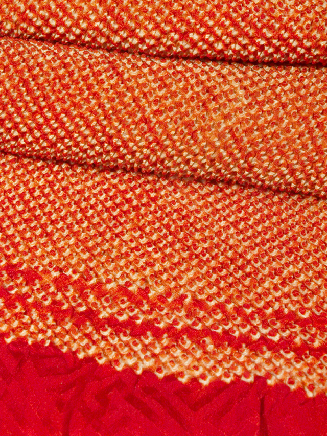 猩々緋(しょうじょうひ)色の地に、紗綾形(さやがた)の地紋が織り出され、鹿子の絞り染めでつぼだれの文様がが施されている紋綸子縮緬の帯揚げです。 昭和初期ごろにつくられたと思われるアンティークのお品です。ふんわりとやわらかな手ざわりの縮緬地です。 片方の端に直径約 1mm の小穴が 1 か所あるほか、もう片方の端から約 37cm に直径約 2-3cm のうすよごれが 1 か所ありますが、あまり判別はつかず、気にはなりません。そのほかに目につく大きなしみやよごれ、褪色などのダメージはなく、この時代のものとしてはきれいな状態なので、アンティークにご理解のある方であればご着用は可能です。 |