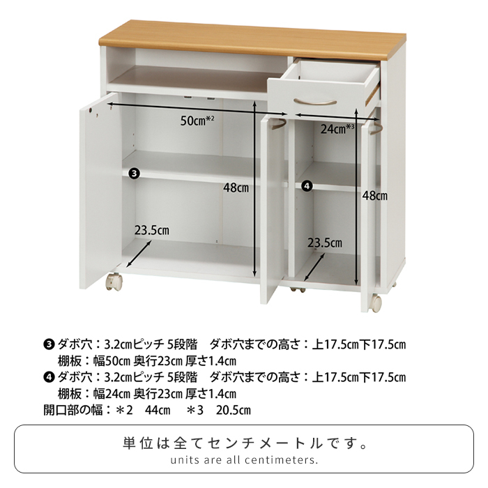 | [オープン部] 内寸:幅50×奥行26×高さ10.5kg [引出] 内寸:幅21×奥行22×高さ8.5(側面高さ:7)cm [扉収納(左)] 内寸:幅50(開口部の幅:44)×奥行23.5×高さ48cm 棚板:幅50×奥行23×厚さ1.4cm ダボ穴:3.2ピッチ5段階 (ダボ穴までの高さ:上17.5cm/下17.5cm) [扉収納(右)] 内寸:幅24(開口部の幅:20.5)×奥行23.5×高さ48cm 棚板:幅24×奥行23×厚さ1.4cm ダボ穴:3.2ピッチ5段階 (ダボ穴までの高さ:上17.5cm/下17.5cm) |