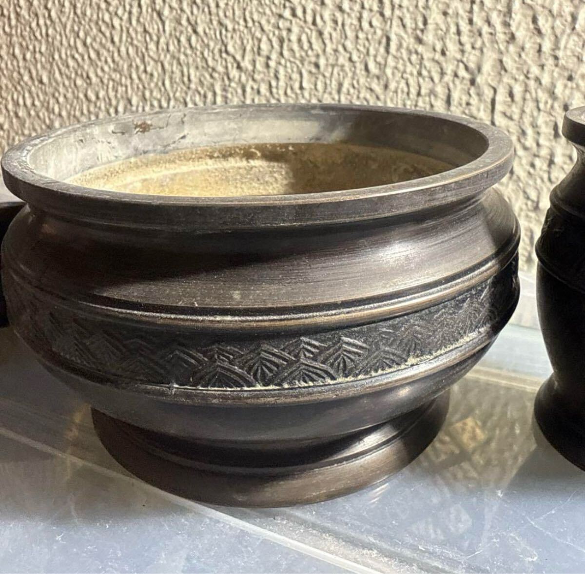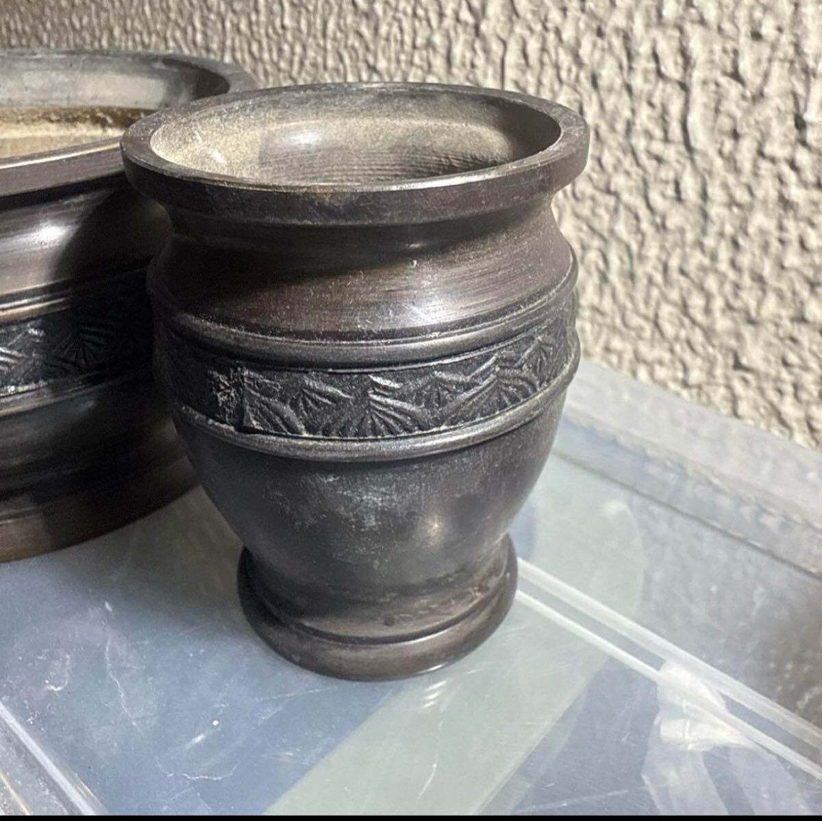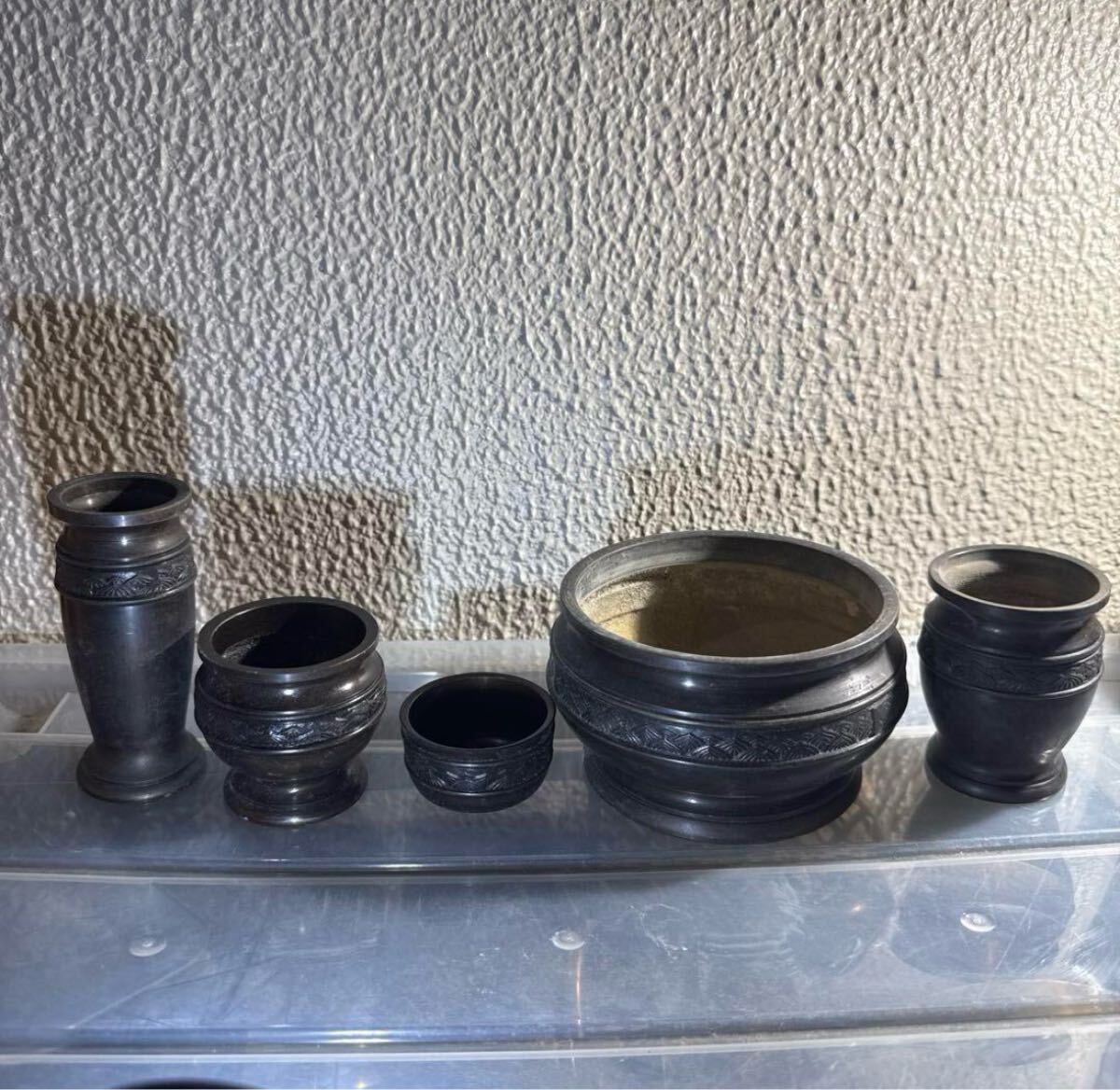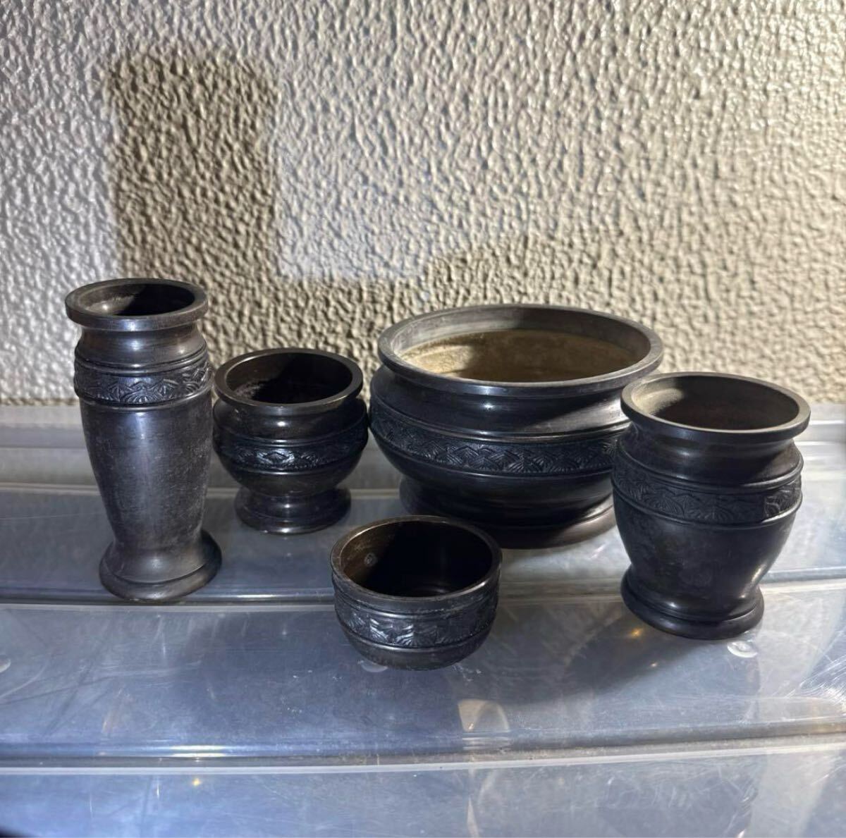 仏壇用の仏具5点セットです。落ち着いた黒色に彫刻模様が施された上品なデザインで、仏壇に重厚感を添えます。| 出价者 | 信用 | 价格 | 时间 |