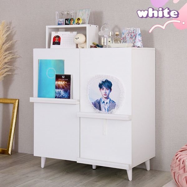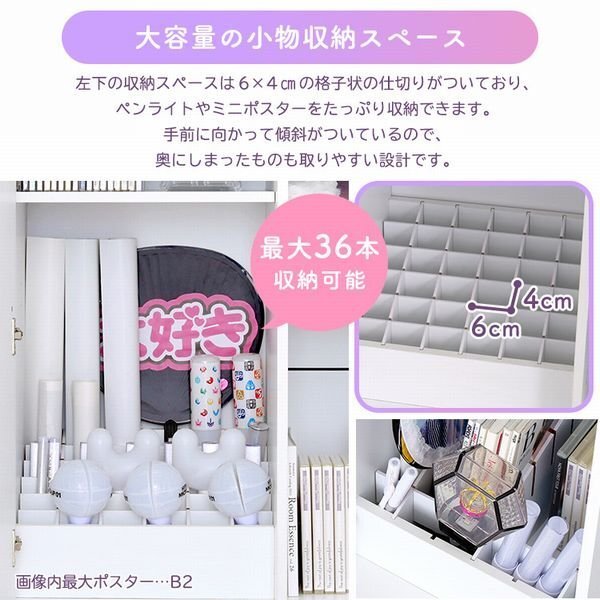 | 収納たっぷり推し活キャビネット! 推し活に特化したキャビネット収納なので、お手持ちのグッズなどをたっぷりと収納できます。 可動棚は全て手前と奥で高さを変えられる祭壇仕様になっています。 引き出し部分は取り外し可能な仕切りつきなので、ペンライトやミニポスターなどをたっぷりと収納できます。 |