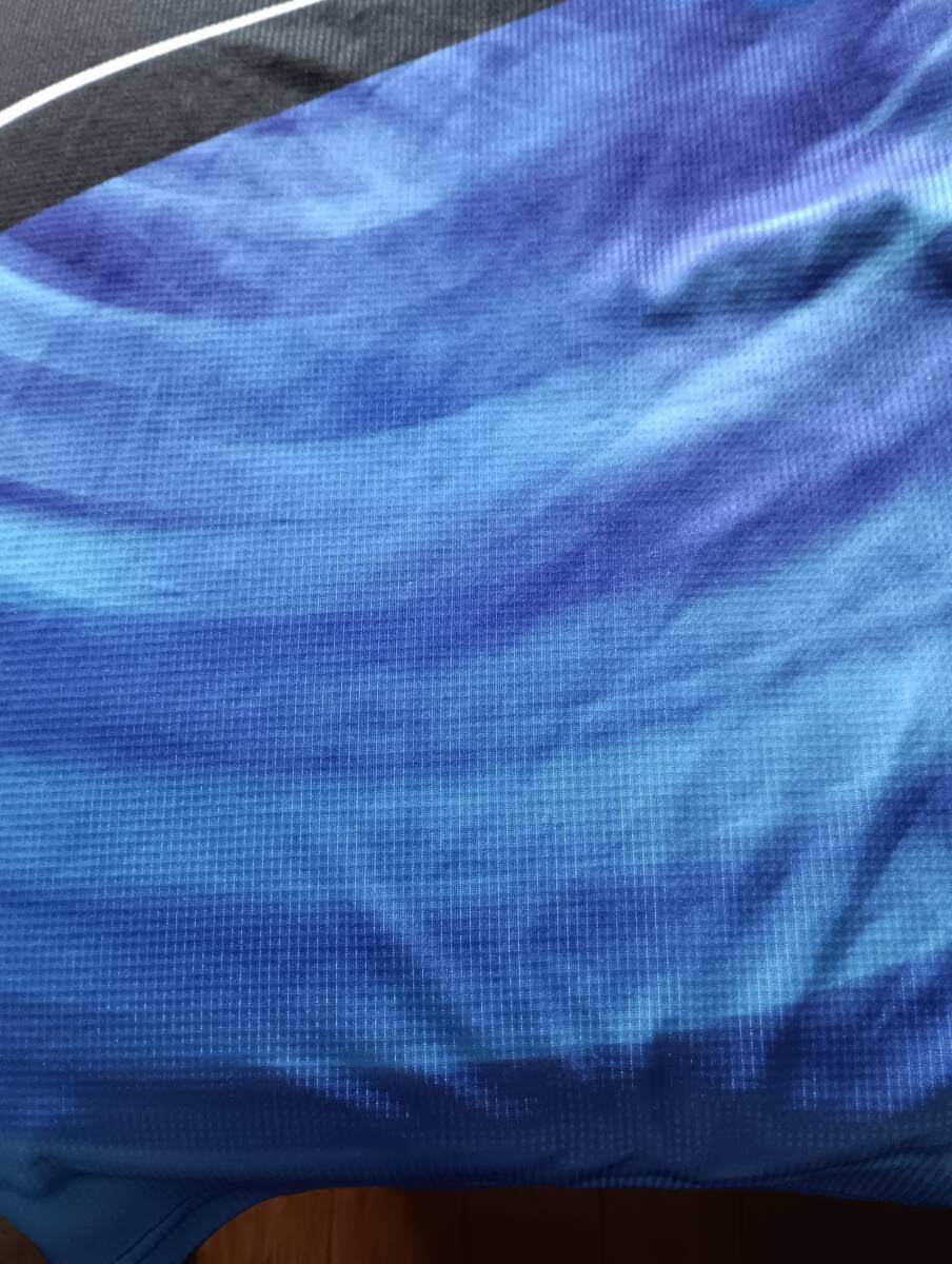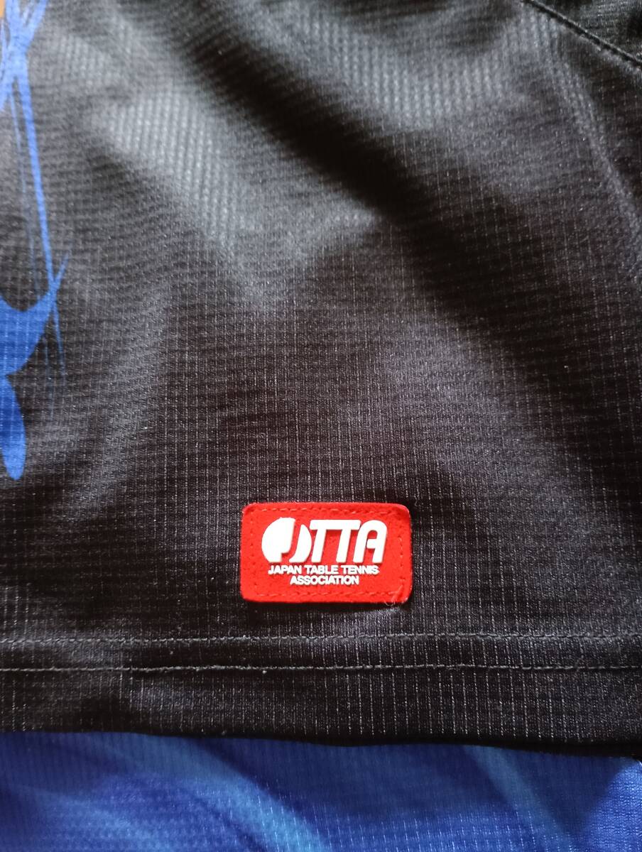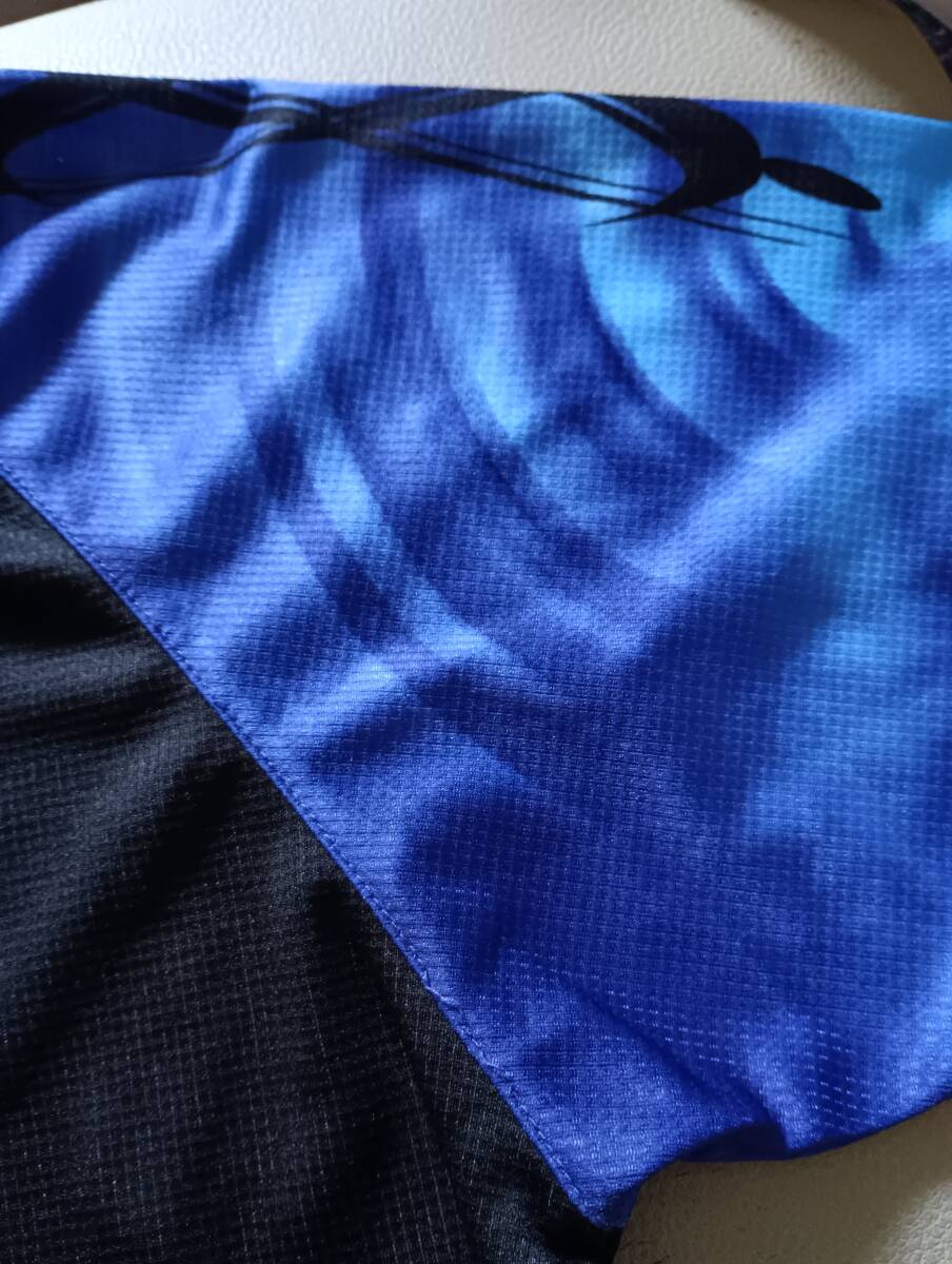 ヤサカ卓球ウェア、青の中古Mサイズです。JTTAマークも有ります。肩口に流れるような炎の柄が有り、肩の大部分は黒です。サイズマークや素材説明は切れて有りません。背中も大部分は黒ですが表面の胸からお腹の部分にはヤサカのマークと斜め線が有ります。今回は特別価格で提供致します。