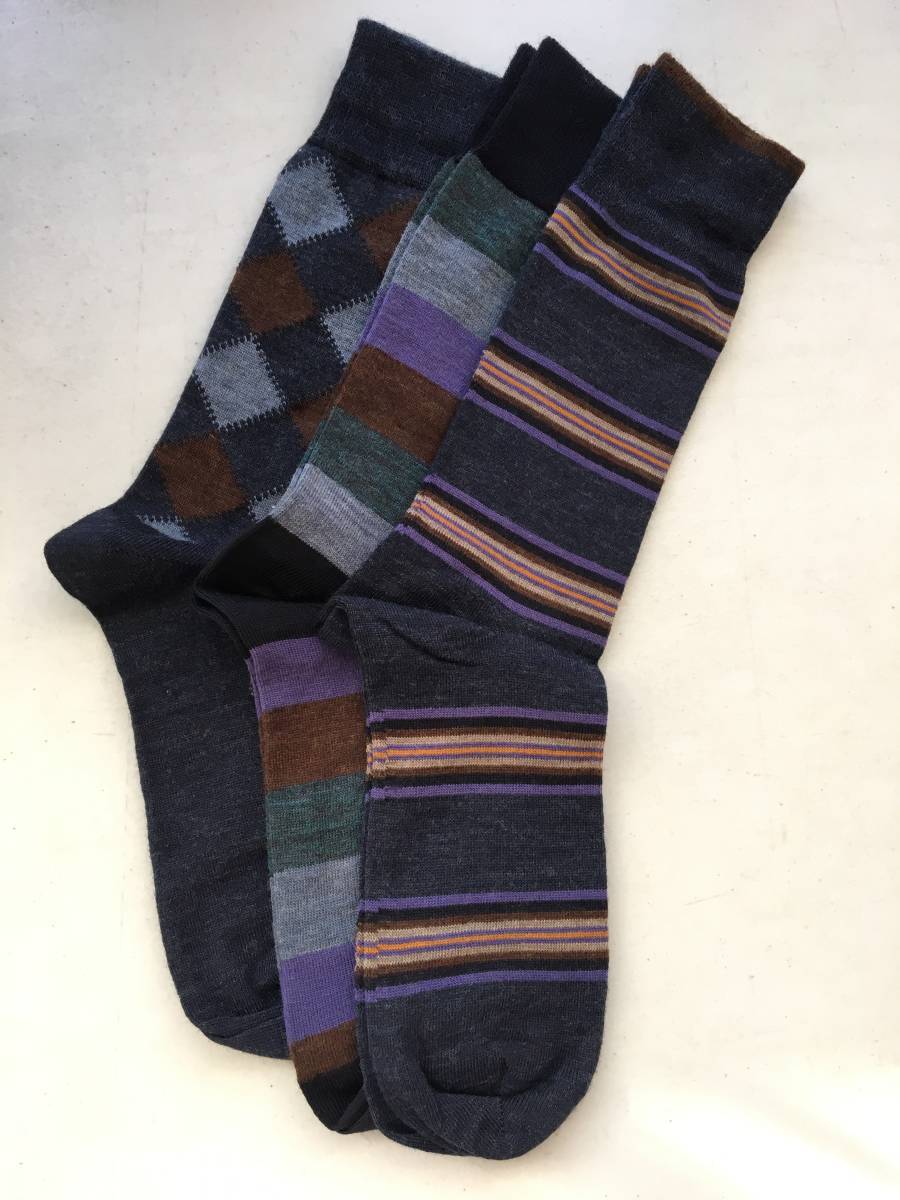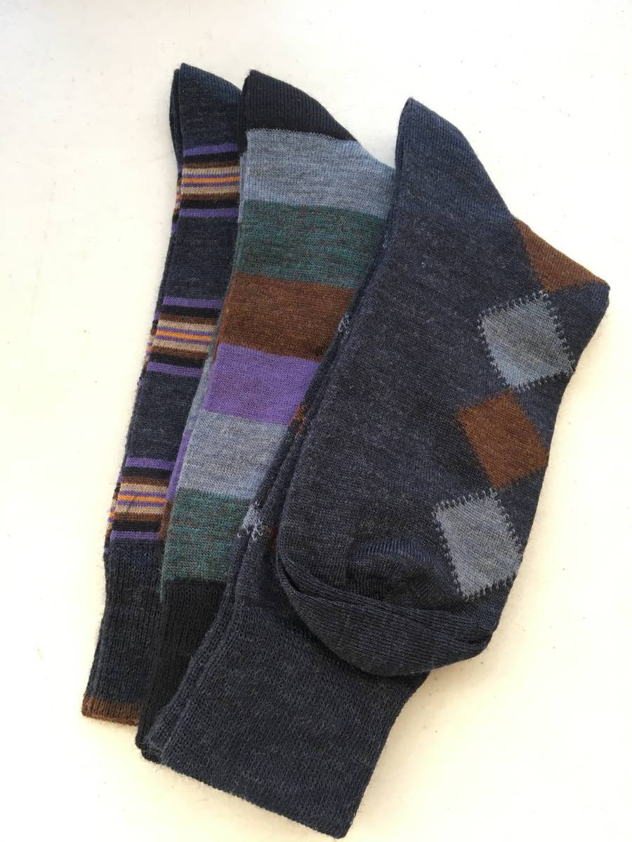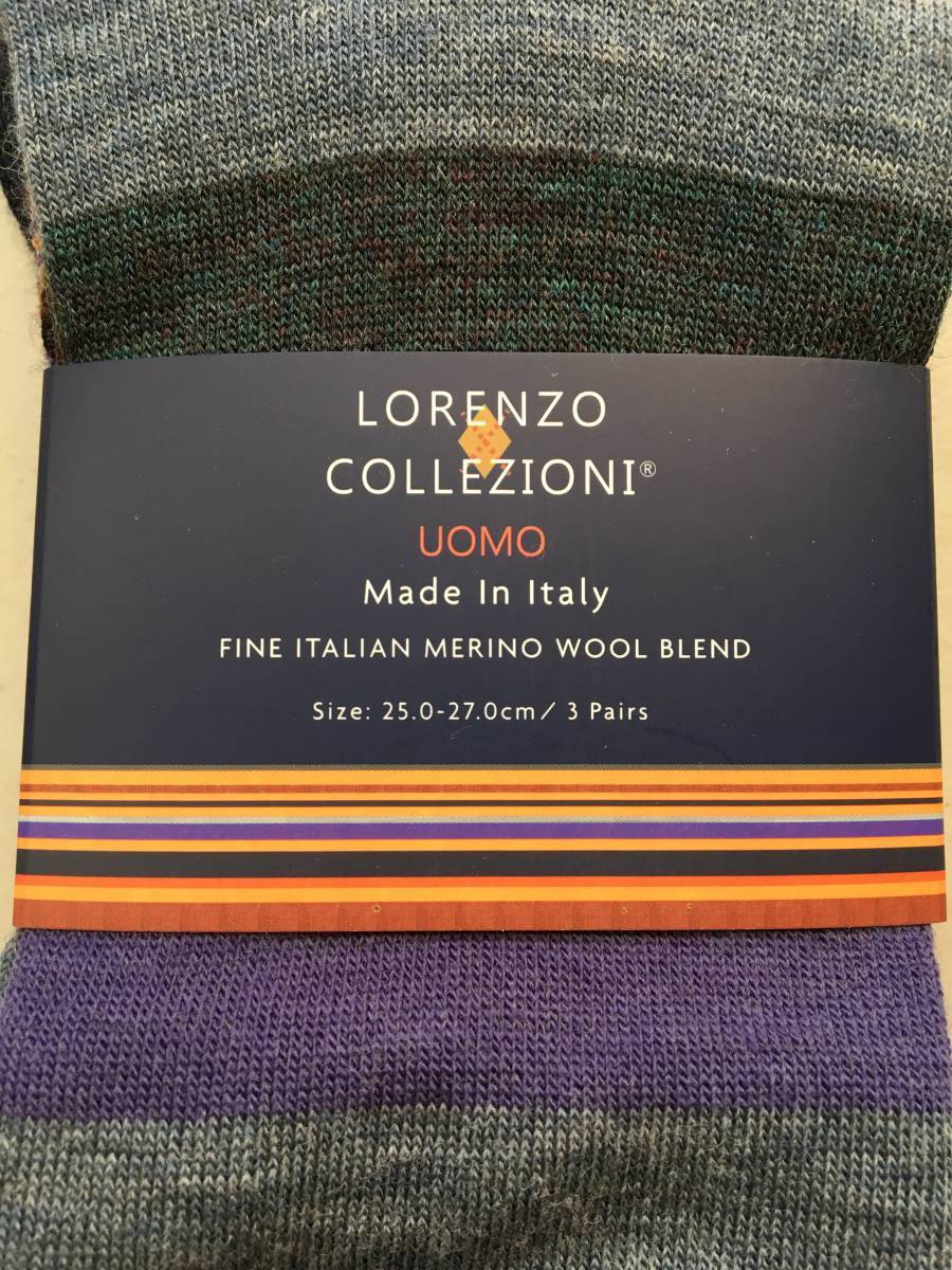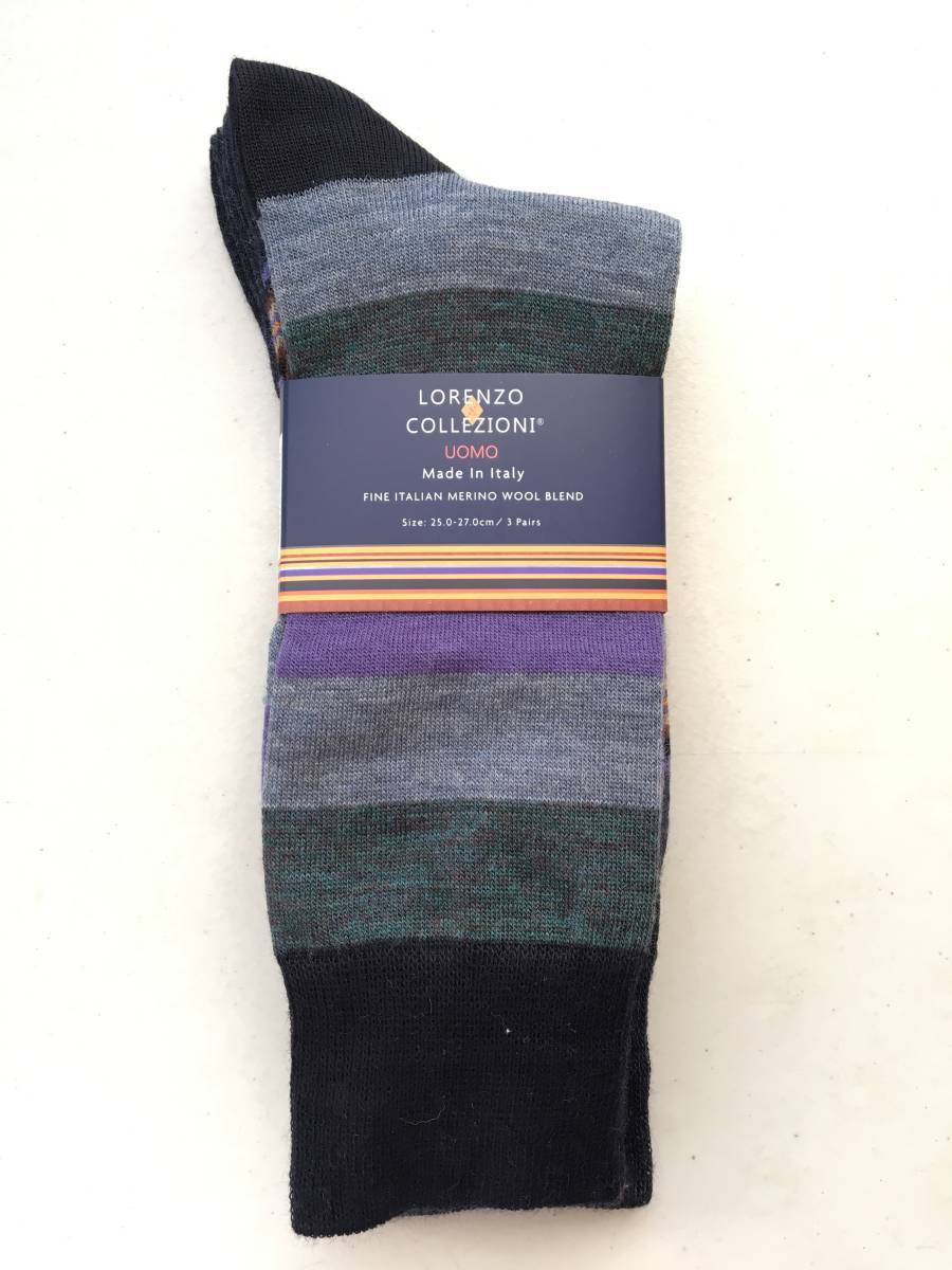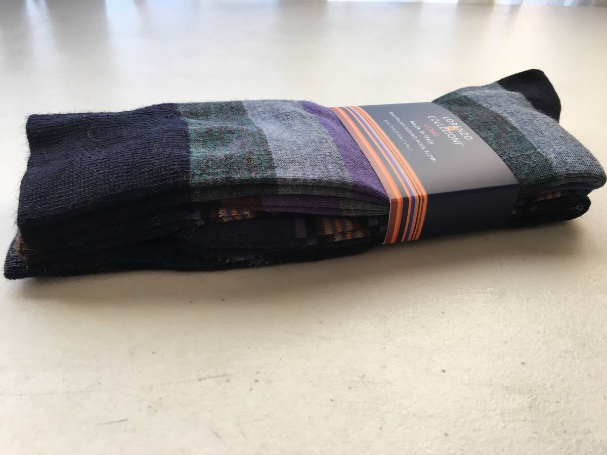 | LORENZO COLLEZIONI UOMO イタリア製 メンズ 薄手ソックス 3足セット 素材:ウール・ナイロン・ポリウレタン(メリノウール100%ではありません) カラー:紫系 柄 サイズ:25-27cm 全長:約42cm かかとからの長さ:約26cm 発送:レターパック(2セットまで同梱可) | |