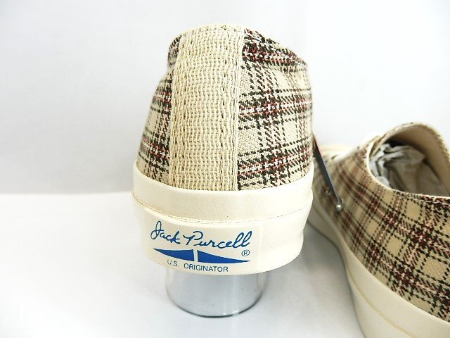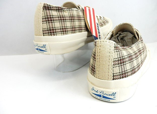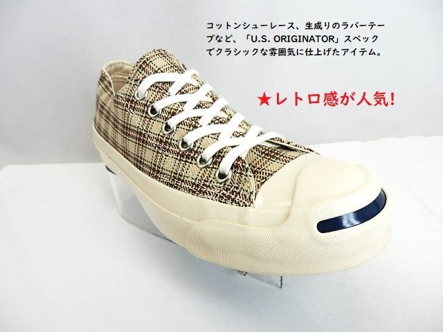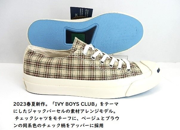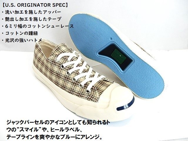 | ◆IVY BOYS CLUB」をテーマにしたジャックパーセルの素材アレンジモデル。 チェックシャツをモチーフに、ベージュの同系色のチェック柄をアッパーに採用 WH/1SD322クラシックなローカットモデル]★ ●1935年誕生の『JACK PURCELL』は、 同名のバドミントンプレイヤーが開発に参加したことでも知られる、 コンバースを代表するアイコンの一つ。レトロ感が人気です。 ヒールラベルはそのデザインから“ヒゲ”の愛称で親しまれ、 またトゥ部分のラインは微笑んでいる口元のように見えるため“スマイル”とも呼ばれており、 シンプルで洗練されたデザインは今もなお根強い人気を誇っています。 | |