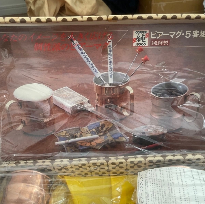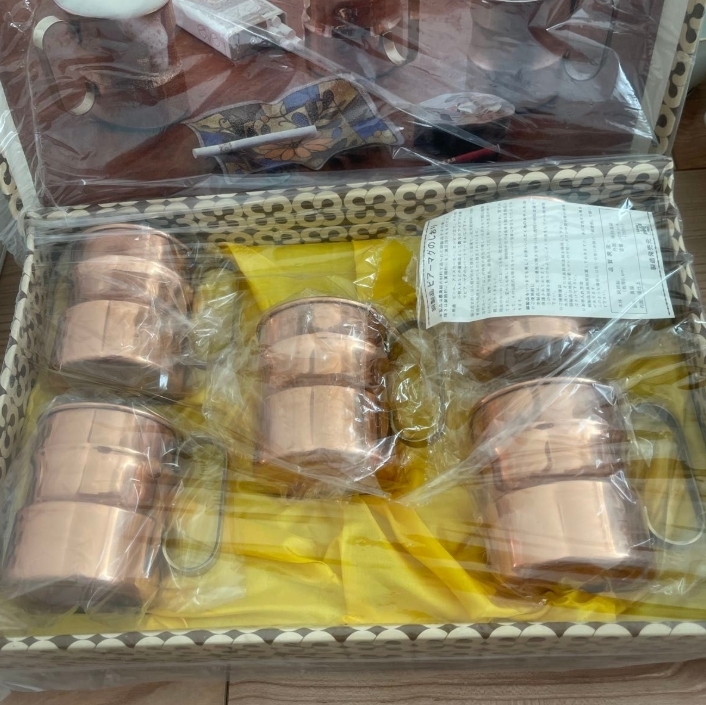 純銅製ビアーマグ5客組です。 未使用品ですが、長期自宅保管品です。 箱に経年劣化による傷みがあります。 写真にて状態をご確認の上、ご検討ください。