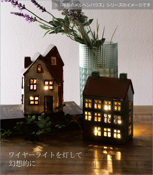 | 商品情報 陶器のノスタルジックなハウスは カラフルなカラーの組み合わせとフォルムが ヨーロッパの牧歌的な風景を思わせる 可愛いデザイン 不均一な窓の大きさや ちょっぴり曲がったラインが 絵本から飛び出してきたような 優しい雰囲気を醸し出しています 市販のLEDキャンドルを入れると 窓からほんのり灯りがもれて 昼間とは違った表情を楽しめそうです ハンドル付きで明かりを灯しながら 移動も楽々です 商品名 : 陶器のメルヘンハウス ハンドル付きキャンドルハウス C 商品番号 : toy9804 全体のサイズ(cm) : 幅12.5×奥行9×高さ21.5(取っ手を含まない) 材質 : 陶器 重量 : 720g 生産国 : 中国 ※手作り品のため色ムラや形状、僅かなサイズの違いはご容赦ください ※ディスプレイによる色の違いはご了承下さい |