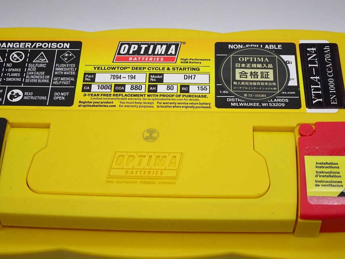 | オプティマバッテリー イエロートップ / OPTIMA BATTERIES NEWモデル YTL4-LN4 ( YT DH7 ) Lタイプ D端子(大ポール) 大人気の高性能ディープサイクル/スターター兼用バッテリーです。 正規品 安心のメーカー3年製品保証付 ※但しエンジン始動用としてのみ カーオーディオの音を決めるのは内部抵抗の低さです。! 最強のバッテリー登場! ディープサイクルと優れた始動性を併せ持つ最強のAGM、欧州車DIN規格登場! 輸入車 L4、国産車 LN4 に対応 AGMなのでアイドリングストップ、充電制御、ハイブリッド車補機にも対応 弊社テストではこのクラスで見たことのないCCA数値(笑)、カタログ値軽くオーバー!!間違いなく最強です。 聞きたい方はお問い合わせください!! ■ ジープ 適合■ 下記車種で純正バッテリーがLN4(L4)規格の場合適合。※必ず実車にて確認必要です。 ・グランドチェロキー(WK64,WK36A,WK36,WK36T,WK36TA,WK57A) ・チェロキー(KK37,KL24,KL32)等 ・コマンダー(HX47,HX57) 国産対応車種(LN4) スープラDB22(シートヒーター無)、グランエース(GDH303W 2019~)、レクサスLC500(URZ100 2017~)、レクサスLX600(2022~)、 ハイラックス(N125系) 輸入車対応車種(L4) L4 サイズ W315 x D175 x H190mm のLタイプの車種 欧州車で80Ahクラス搭載車 ・メルセデス(A180,A250,A45AMG,B180,B250,CLA180,CLA220,CLA250CLA,CLA45AMG,CLA220,CLS350,CLS400,CLS550,CLS63AMG,GLA180,GLA220,GLA250,GLA45AMG,GLK350等) ・BMW、アウディー(LN4サイズ搭載車各種) ・MINI ミニ クラブマン(LR20,LN20,LN15,LVJCW等)、その他車種LN4(L4)搭載車 ・ボルボ(S90II,V90II,XC60II,XC90II等) ・ポルシェ(911,ケイマン等) ・ランドローバー等 互換バッテリー VARTA : AGM 580 901 080 (F21) 、LN4AGM、585 400 080(F19) MOLL : EFB 82080 、 84085 BOSCH : BLA-80-L4 AC Delco : LN4AGM ※同じお車でも、グレードや排気量により、場合によって は適合しないお車があります。 必ず現車でバッテリーの型番をご確認ください。 用途 スターター、ディープサイクル Lタイプ D端子(大ポール) 電圧 12V 20時間率容量 80Ah (国内公式値70Ah) コールドクランクアンペア 880CCA(国内公式値 1000CCA、実測 1100CCAオーバー) クランクアンペア 1000CA 内部抵抗 2.6mΩ リザーブキャパシティー 155分 サイクル寿命 350サイクル エンジン始動可能回数 12000回以上 幅 奥行 総高さ/箱高さ 315W x 175D x 190H 下部止め形状 長辺、短辺共に10.5mmのつば固定 重量 27.0Kg 正式型番 : 7094-194 Group : H7 ハンドル付 正規品 メーカー3年製品保証付き (エンジン始動用に限る) ※スパイラルではありません。フラット構造です。 オプティマ専用充電器も取り扱ってます。 お問い合わせやオプション等詳細は 当店のサイトへ 適合バッテリー専用お問い合わせフォーム(SSL使用で安心です) OPTIMA本国サイト | |||||||||||||