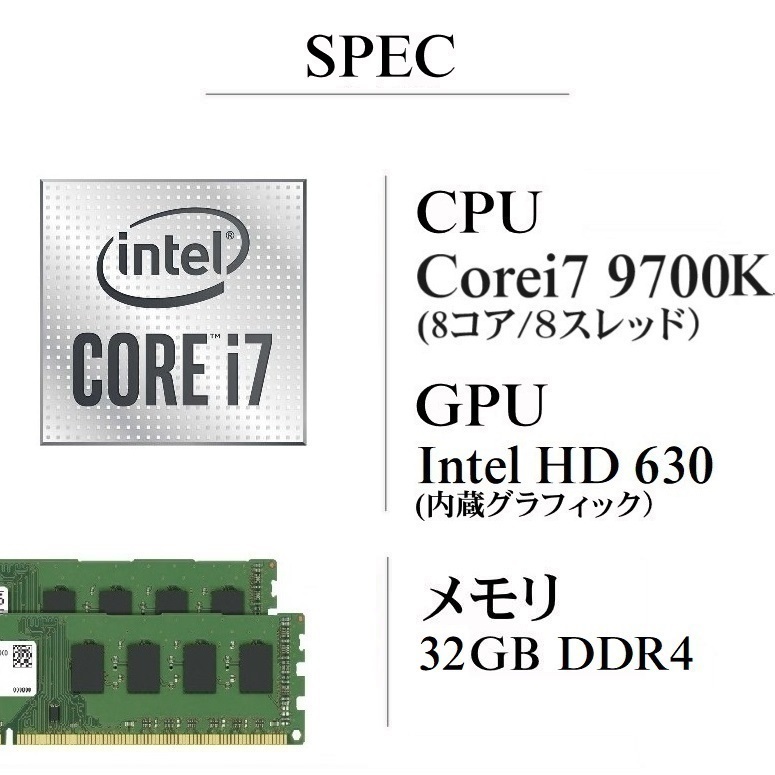 9000系最上位K番CPU搭載! コアの数 8 スレッド数 8 プロセッサー ベース動作周波数 4.90GHz キャッシュ12MB IntelR Smart Cache バススピード 8 GT/s TDP 65W | ||||
