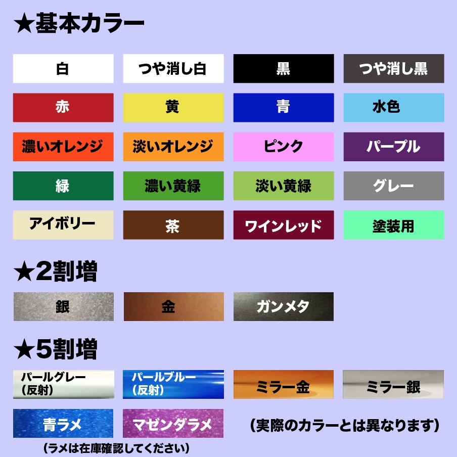 | 備 考 | ★伸びやすいシートですので、車の曲面にも貼 れます。 ★塗装用は、2種類の作成方法がございます。 ★再剥離シートは、剥がした時、糊の跡が残りにくいです。 ★大きいサイズをご希望の場合は、お問い合わせ下さい。 ★縮小は、デザインによって出来ない場合がございます。 |
