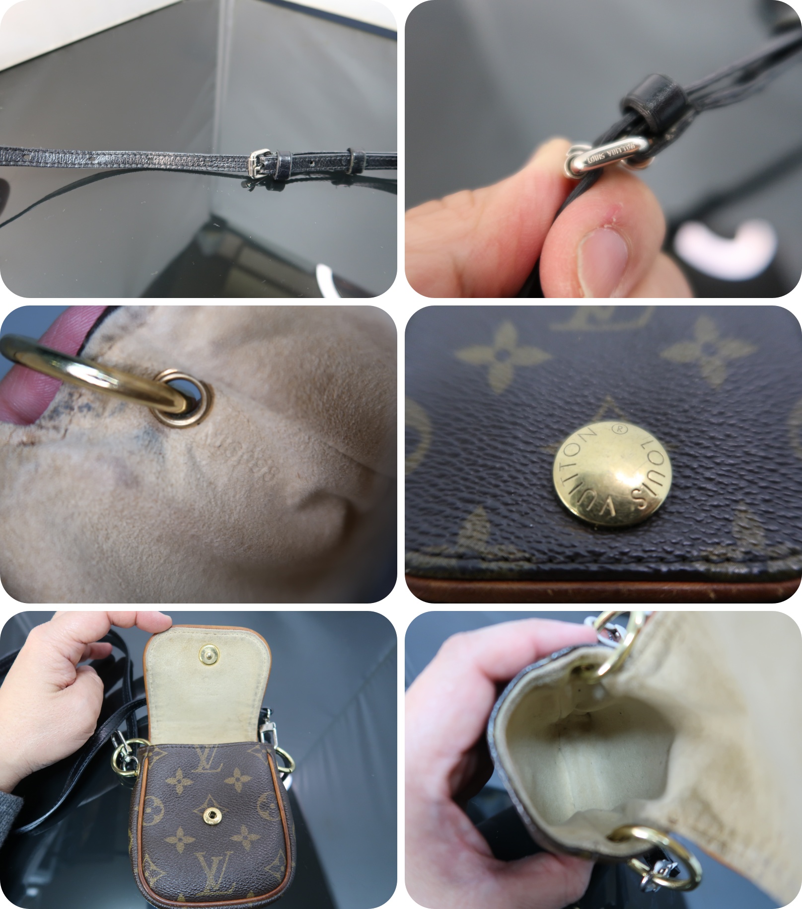| <外側> | 良品です。 ベルトに使用感あります。また、ショルダーベルトを取り付けるため、金色のリングを取り付けております。こちらはもともとの穴に通しておりますので、ご不要であれば外すことができます。取付には特に加工はしておりません。 |