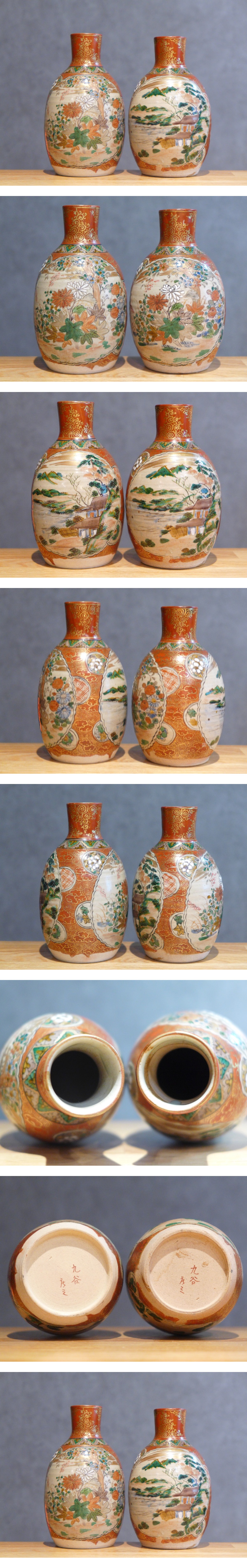 時代物 九谷焼 庄三銘 金襴手山水図 徳利 一対 2客。高:約13cm。高台に窯疵あり、経年感あり。時代なりの状態かと思われます。経年保存品の為、画像をよく見て頂き、状態に了承いただいた方のみの御入札をお願い致します。★★当オークションにて他にも陶磁器類を出品しております。是非一緒にご覧下さい。★★