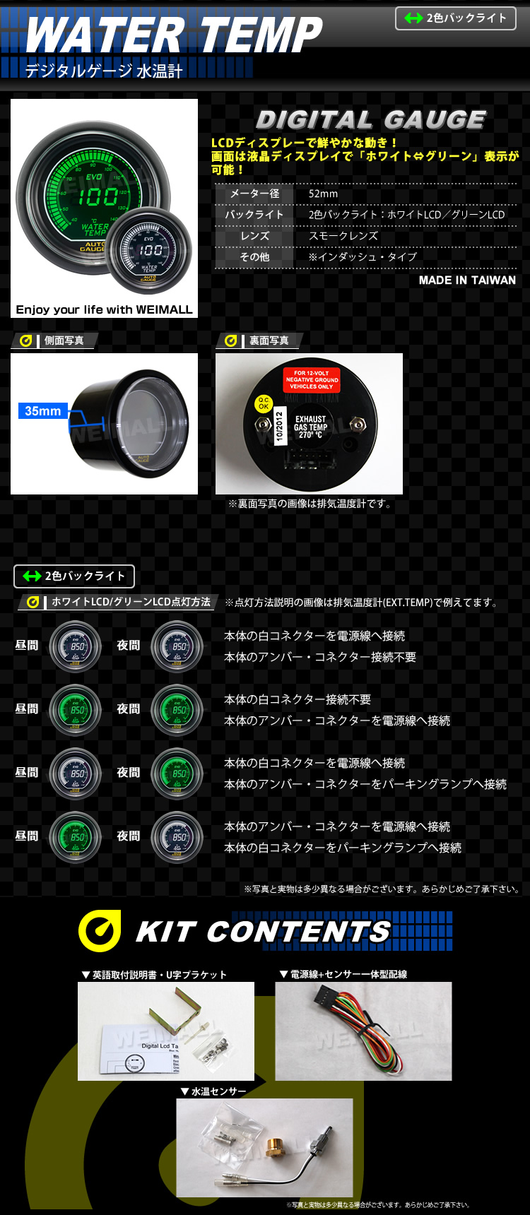 | デジタルLCDディスプレイ デジタル水温計 52mm グリーン/ホワイト |