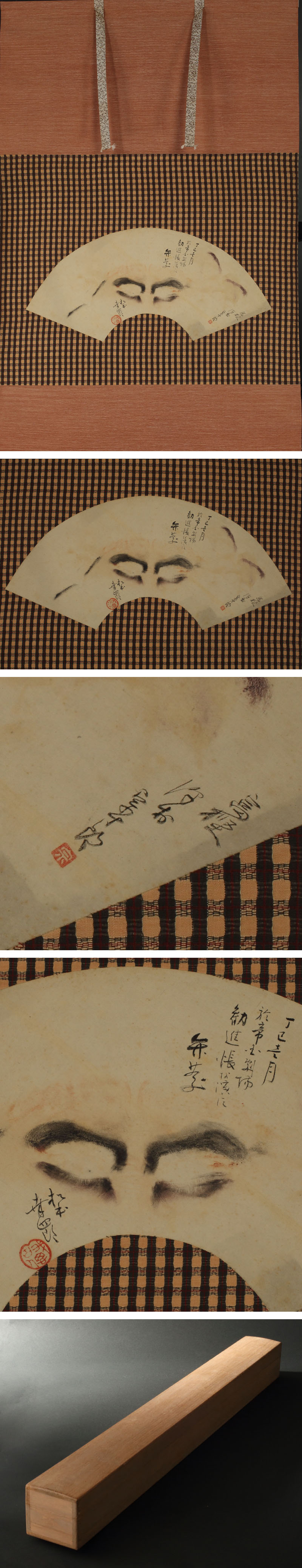 大正期の押隈です。 七代目松本幸四郎が弁慶、初代澤村宗之助が義経、七代目澤村宗十郎が富樫を演じた、大正6(1917)年の帝国劇場新春興行の『勧進帳』の際の化粧を写し取ったものです。 帝劇での『勧進帳』の興行は大正3(1914)年以来で(伊坂梅雪『勧進帳考』)、空前の好景気で大衆娯楽が活況を呈す中「初日(元日)以来ぶつ通し満員」であったことが知られます(「世の中 第三巻第二号」)。誌上の劇評の多くも200回以上演じられてきた幸四郎の弁慶は「今更評する迄もない」としながらも「当代一等」「日本一」の称賛が目立ち、初役宗十郎も「上出来」、宗之助の義経は「天下一品の美男」と絶賛されております。 歌舞伎史に遺る綺羅星の如き名優の演技と「帝劇」の栄光が克明に刻まれた逸品です。 【参考文献】 「大正6年1月 帝国劇場 春日局と勧進帳|栢莚の徒然なるままに」〔https://ameblo.jp/germans-badman/entry-12851080298.html〕(最終閲覧日2026年4月2日) ◆七代目松本幸四郎 明治-昭和期の歌舞伎俳優。二代目藤間勘右衛門の養子。九代目市川団十郎の門にまなび,八代目市川高麗蔵をへて,明治44(1911)年幸四郎を襲名。「勧進帳」の弁慶が当たり役。荒事,所作事を得意とし,オペラや翻訳劇にも出演した。舞踊藤間流家元。長男が十一代目団十郎,次男が八代目幸四郎,三男が二代目尾上松緑。昭和24(1949)年没、80歳。本名は藤間金太郎。俳名は錦升。屋号は高麗屋。 ◆七代目澤村宗十郎 明治-昭和期の歌舞伎役者。四代目沢村源平を名のり,東京で初舞台。養父四代目助高屋高助の死後大阪にうつり,三代目沢村訥升をへて明治41(1909)歌舞伎座で宗十郎を襲名。帝国劇場ができると専属になり,二枚目,女方として活躍。最後の和事師とよばれた。昭和24(1949)年姫路の舞台中に没、75歳。本名は沢村福蔵。俳名は高賀,東輝。屋号は紀伊国屋。 ◆初代澤村宗之助 明治-大正期の歌舞伎役者。七代目沢村訥子の次男。初代助高屋小伝次の弟。明治22(1889)年初舞台。子供芝居で活躍。同36(1903)年「ジュリアス=シーザー」を英語で演じ,川上音二郎劇団,自由劇場にも参加。のち帝国劇場の幹部俳優となり,女方,立役のいずれもよくした。大正13(1924)年没、39歳。東京出身。本名は伊藤三次郎。俳名は杏園。屋号は紀伊国屋。 付属:時代箱が付属します。 寸法:高さ103cm、幅66cm(最大幅。若干の誤差はご了承下さい) 状態:経年のイタミがございます。 |