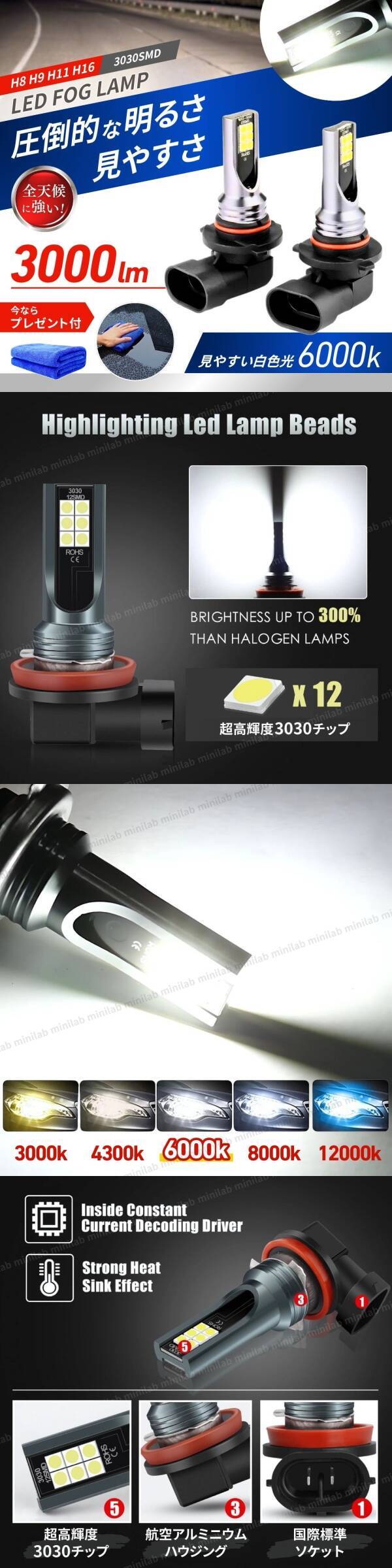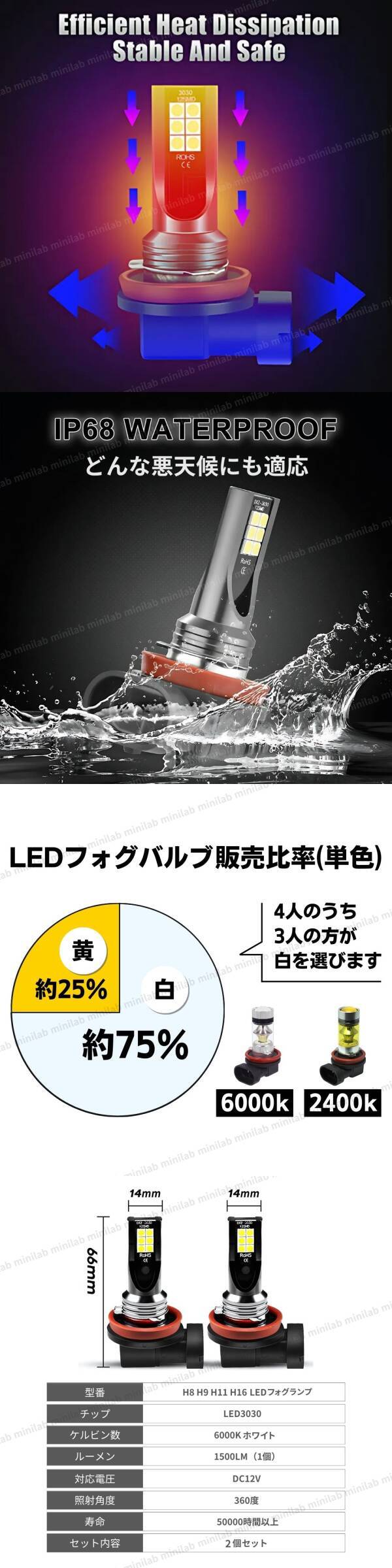 | H8 H9 H11 H16 対応 LEDバルブ フォグランプ 2個セット 6000k ホワイト |