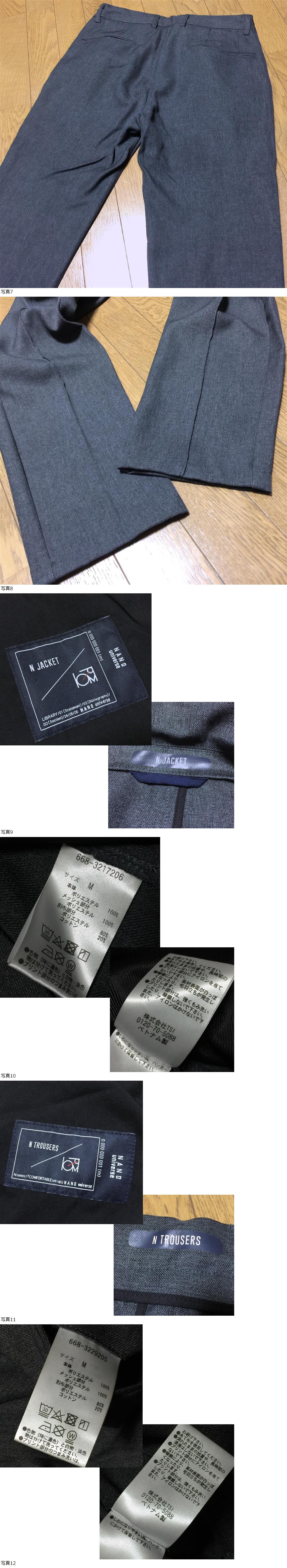 | 【ブランド】 NANO universe ナノ・ユニバース 【デザイン・モデル】 N JACKET / N TROUSERS アンコンジャケット トラウザーパンツ ライトウーリッシュツイル セットアップ スーツ 【生産】 株式会社TSI 【詳細・コメント】 NANO universe ナノ・ユニバース セットアップ スーツです。『機能性と上品さを兼ね備えたコンフォータブルな1着』快適な着心地を実現しつつ、より綺麗なシルエットを追求したシリーズ“ N jacket/N Trousers”。ストレッチ性のあるリサイクルポリエステルを使用し、空気を含んだウールのような質感が魅力。気軽に羽織れる軽さや、とにかくラクな着心地が魅力。ニットやTシャツの上に羽織るだけで締まりのある印象を漂わせつつ、抜け感と上品さが入り混じった大人な一着に仕上がっています。 普段使いからビジネスと幅広く対応可能で、1着あると重宝するアイテムです。 正規品です。定価(ジャケット)\13,970+(パンツ)\11,990 税込計\25,960です。 【サイズ】 表記: M ※実寸を参考にして下さい。 平置実寸:平置実寸:(ジャケット)身幅50㎝ 着丈69cm 肩幅44㎝ 袖丈62㎝ (パンツ)ウエスト78㎝ ゴム・紐入り 股上27cm 股下75㎝ ワタリ幅30㎝ 裾幅約17㎝ ※多少の誤差はご了承ください。 ※多少の誤差はご了承ください。 【カラー・パターン】 チャコール グレー ※ご覧になられるモニターや、デジカメの撮影具合によって色味が異なる場合がございますのであらかじめご了承ください。 【品質】 本体:ポリエステル100% メッシュ部分:ポリエステル100% 別布部分:ポリエステル80% コットン20% 【コンディション】 未使用タグ付きです。自宅保管品の為、神経質な方は入札をお控えください。※販売時より多少時間が経過しておりますので、完全な新品をお求めの場合は、入札をお控えください。写真参考に判断して下さい。 | |||
