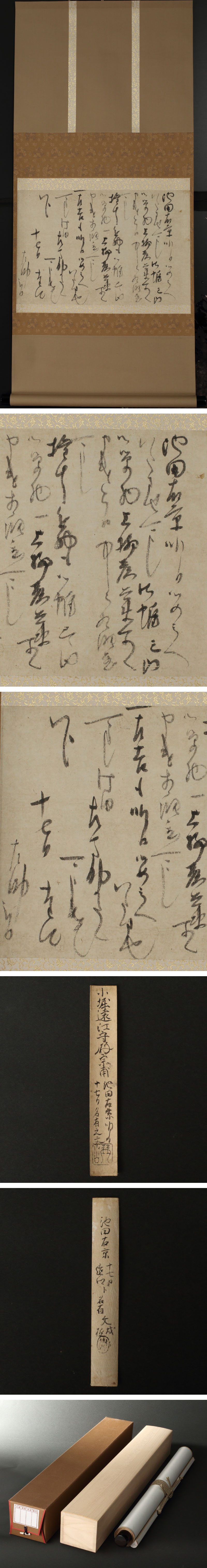 小堀遠州の消息です。 家臣・村瀬左助に宛てた書で、「池田右京」が昨日お目見したので、上林彦兵衛(甫斎)に進物の帷子を急ぎ調製させるよう命じ、弟小堀正春(左馬助)の子・正憲(左吉)も明日お目見させるよう伝言した書です。 村瀬左助は遠州の作庭における重要人物として知られ、家老格としての業務の傍ら、金地院や筑前福岡藩などに招かれ、作庭の現場監督を務めたことで知られます。一方で上柳彦兵衛は幕府の呉服師であり、当時養蚕業が衰退した日本において、唐船から輸入される生糸が優先的に分配された特権商人の一人でした。家人縣宗知とともに遠州流の茶人であったことが知られます。 文中「池田右京」を播磨赤穂藩主池田政綱とすれば、寛永8(1631)年7月29日の死去に先立つ書と推察され、この「お目見」は本来は無嗣改易となる所を特例で弟・輝興が継ぐことが認められたことを指すと見られます。『徳川実紀』では政綱の死は7月29日、『寛政譜』では7月7日となっており、恐らくはこの間の7月16日に「お目見」が果たされたのでしょう。遠州は53歳、むろん在府中の書となります。 文末では甥であり娘婿となる正憲のお目見について触れられていますが、当時正春37歳、正憲5歳であり、どこまで本気か――実際は正保元(1644)年にお目見することからも、待望の男児が生まれた弟への「からかい」とも受け取れなくもないでしょう。系譜だけでは決して伝わらない、等身大の遠州の交際が窺える逸品です。 ◆小堀遠州 江戸前期の茶人・武将。遠州流茶道の祖。近江生。名は政一、号は孤篷庵・宗甫、遠州は通称。茶道を古田織部に学ぶ。作事奉行として建築・造園に才を発揮し、二条城・仙洞御所などを手掛けた。また書画・和歌を能くし、画は松花堂昭乗に学ぶ。書画・古器の鑑定家としても有名。のちに伏見奉行となる。正保4(1647)年没、69歳。 ◆村瀬左助 江戸前期の武士・茶人。小堀政一(遠州)の家臣。進物の取次など家老職の傍ら、茶会の相伴や作庭の現場監督を務めた。 ◆上柳甫斎 江戸前期の茶人。京都の呉服商。徳川家康につかえ側向御用をつとめる。かたわら小堀遠州に茶道をまなび,県宗知におしえた。延宝3(1675)年没、85歳。通称は彦兵衛。別号に梅園堂,独月庵。著作に「遠宗拾遺」。 ◆池田政綱 江戸前期の大名。播磨姫路藩主池田輝政の5男。母は徳川家康の娘督姫(良正院)。備前岡山藩主の兄忠雄より播磨赤穂郡3万5000石を分与され,慶長20(1615)年赤穂藩主となる。元和9(1623)年松平姓をゆるされた。寛永8(1631)年没、27歳。嗣子なく絶家したが、徳川家康の外孫にあたることから、幕命により弟 輝興により再興された。 〔本文〕 池田右京昨日御めみへ いたさせ可申候、御帷之内 御単物上柳彦兵衛所へ 申義も今日中ニ相調急 可申候、 猶其進物も御帷之内 御単物一上柳彦兵衛所へ 申遣相調急可申候、 一左吉も明日御めみへ いたさせ 可被下候、此由左馬助かたへ 可申上候 以上 十七日 小遠州 左助 まいる 付属:桐箱が付属します。 寸法:縦104×横47cm(最大幅。若干の誤差はご了承下さい) 状態:機械表具、本紙経年のイタミがございます。 |
