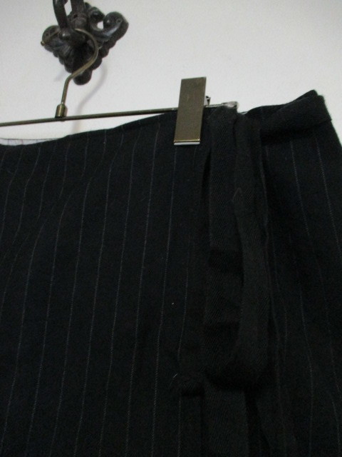 | 商品紹介 | 黒地に紫の細いラインが入ったストライプ柄の スカートです。 巻き型で、左横で紐で結んで留める形になっています。 《素材》 表地:毛56% 綿44% 裏地:キュプラ100% |