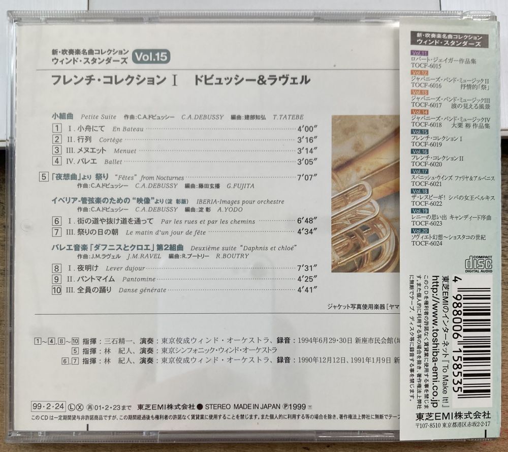 中古CD1990年、1994年録音盤質A帯付き廃盤TOCF-6019新・吹奏楽名曲コレクション ウィンド・スタンダーズ Vol.15 フレンチ・コレクション ドビュッシー&ラヴェル東京佼成ウインドオーケストラ東京シンフォニック・ウィンド・オーケストラ ※ 当店の商品は「未開封品」を含めて経年劣化のある中古品です。 「目立つ傷汚れなし」「新品」の表記でも多少のヨレや色アセがある事があります。 極美品をお探しの方のご要望には応えられない可能性がありますので、購入を控えていただきますようお願いいたします。 ※ 当店の商品は「未開封品」を含めて経年劣化のある中古品です。