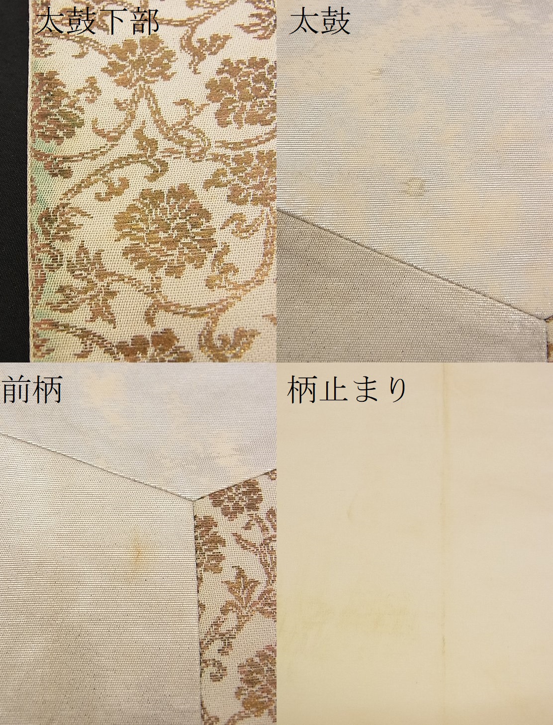 | 【正絹・芯なし】 状態は接写画像のように 太鼓下部・太鼓・前柄・柄止まりに薄い汚れがございますが その他特に目立ったシミ汚れなどもなく大変良い状態です。 大変上質な逸品になります。 お安く出品致しますので、是非この機会にいかがでしょうか?