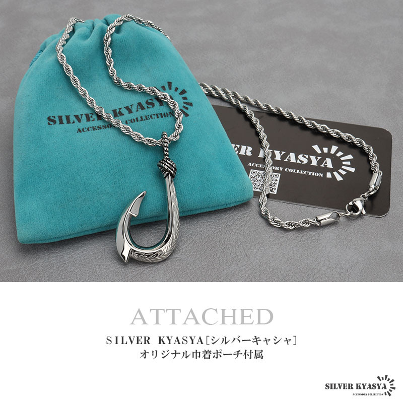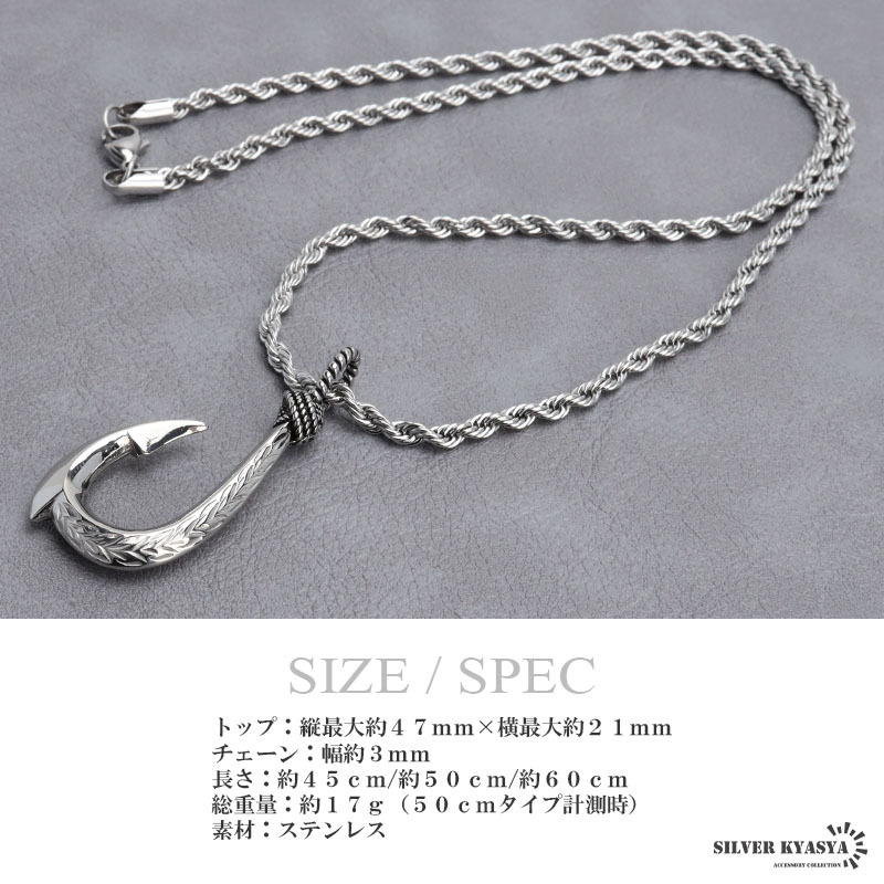 ※こちらの商品は【サイズ:50cm】です。別タイプは別商品ページにてお買い求めください。| 商品概要 | ■ITEM DETAIL フィッシュフック(釣り針)をモチーフとしたネックレス。トップにハワイの自然を感じられるスクロールとマイレをレリーフした逸品。表裏でデザインが違い、気分に合わせて楽しむことができます。 ■ステンレス素材を使用 金属部分は頑丈なことで知られるステンレス素材を採用。耐久性はもちろん耐水性も高く水場での着用も可能。金属アレルギーも出にくいとされている金属です。 |