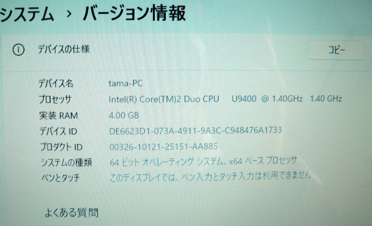 | CPU:Intel(R) Core(TM)2 Duo CPU U9400 @ 1.40GHz 1.40GHz メモリ:4GB HDD:500GB? システム : 64ビット OS : Windows 11 Home 状態:中古のPCです。PC本体のみになります。キズ・ヨゴレありますが、ベト着きありません。Windows 7のシールが貼ってあります。Windows 11が入ってます。バッテリーが残ってたので、ネットができる事は確認してます。 古いPCにOS入れて使ってたみたいで、気持ち動作がのろく感じます。 細かい動作は未チェックです。説明書も商品知識もありません。質問されても分かりませんので写真と説明文でご判断ください。修理・部品取りで使えたらラッキーぐらいでご了承くださる方お願いします。 現状で、ご理解のある方、PCに詳しい方、ご入札お願いします。NC・NRでお願いします。 神経質な方の入札はご遠慮ください。発送はヤマト運輸の予定です。 | |||
