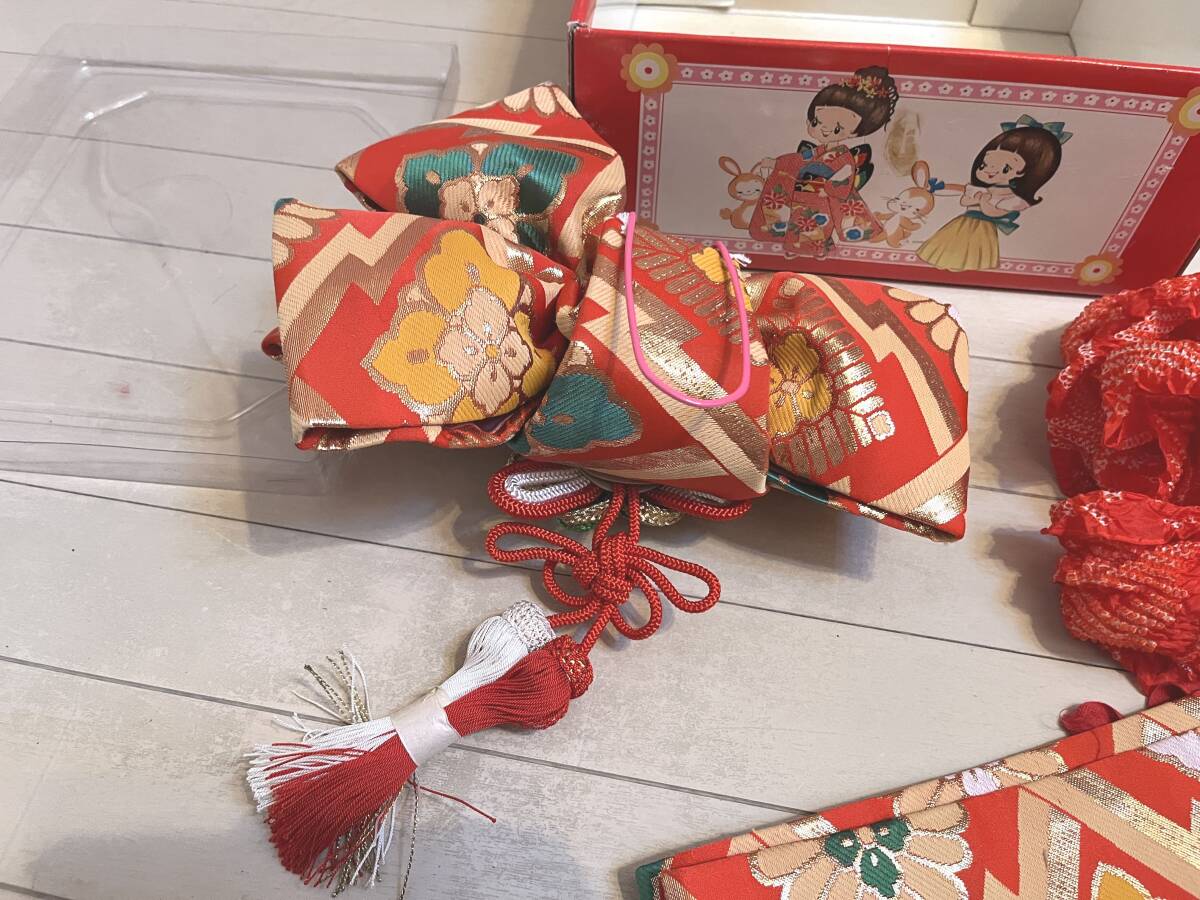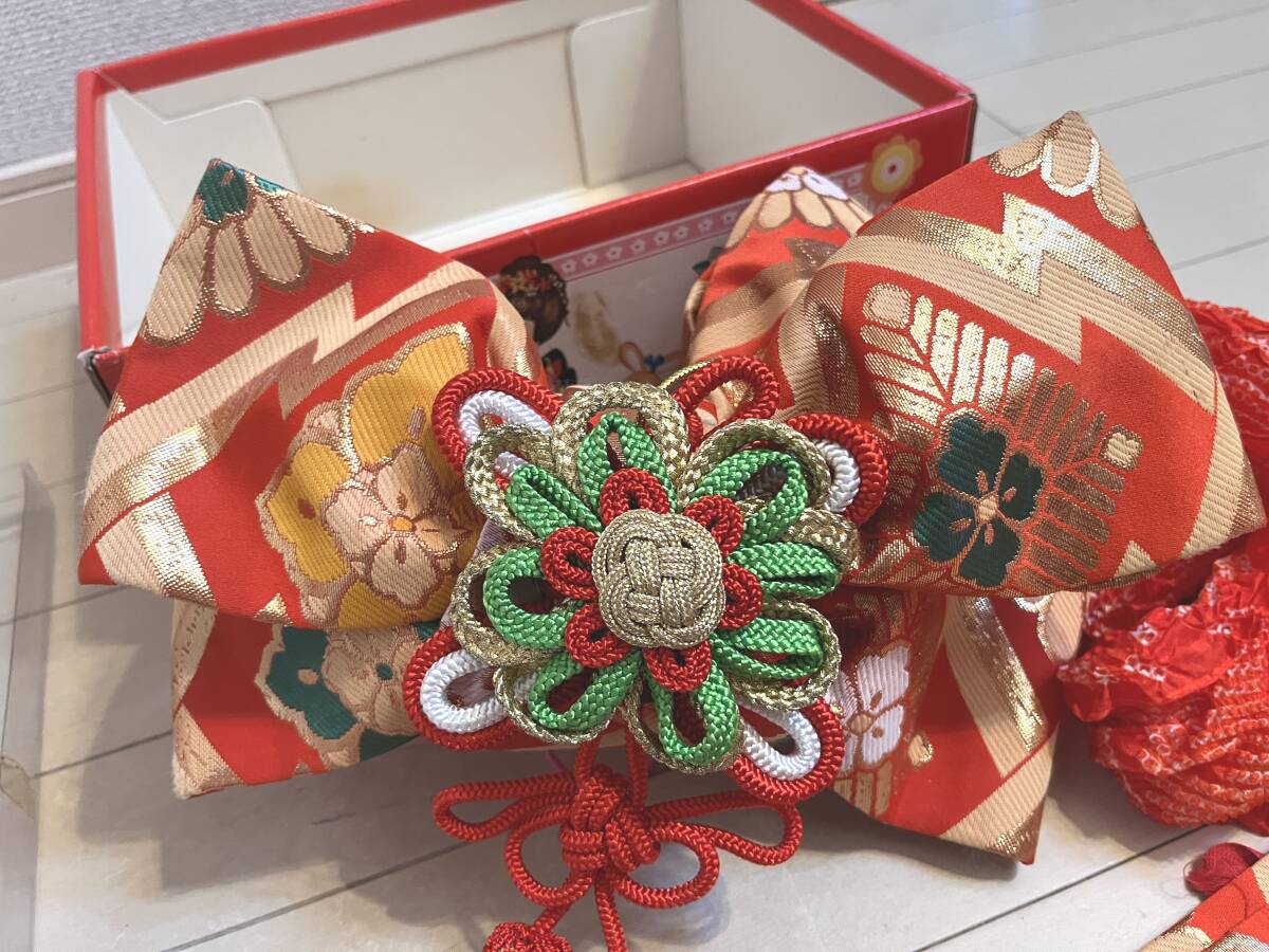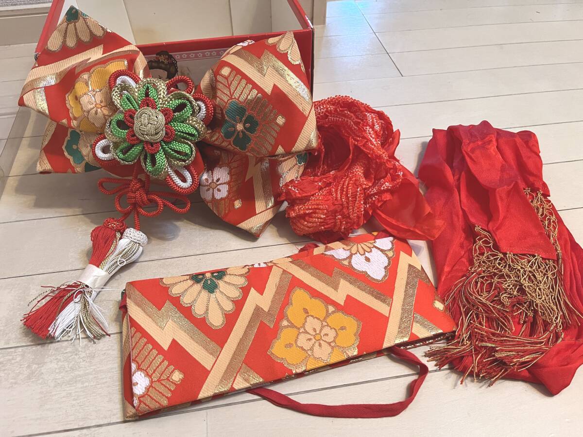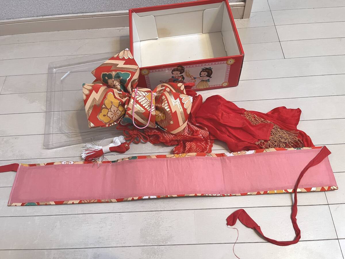 | 結び帯:横約31センチ・縦約22cm/ 本体一体腰帯 幅約11cm・長さ約81cm USED品にご理解頂ける方のご入札ご検討願います。 元箱傷み汚れ有り |