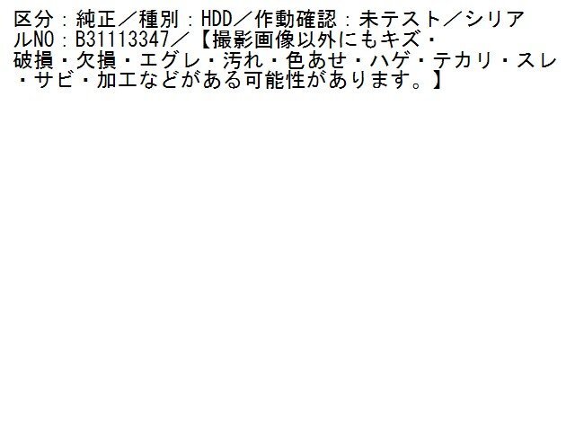 | 商品情報 | 区分:純正/種別:HDD/作動確認:未テスト/シリアルNO:B31113347/【撮影画像以外にもキズ・破損・欠損・エグレ・汚れ・色あせ・ハゲ・テカリ・スレ・サビ・加工などがある可能性があります。】 | ||
