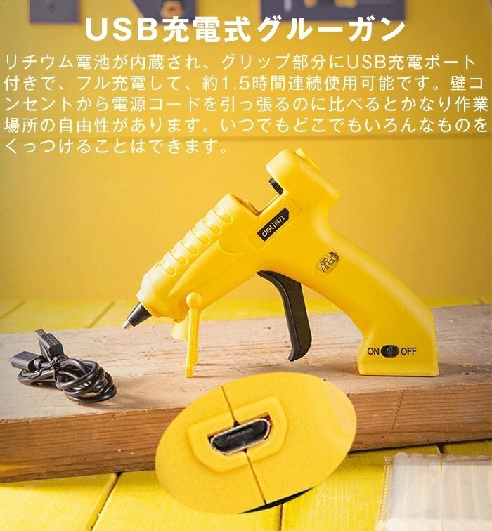 【USB充電式グルーガン】リチウム電池が内蔵され、グリップ部分にUSB充電ポート付きで、フル充電して、約1.5時間連続使用可能です。壁コンセントから電源コードを引っ張るのに比べるとかなり作業場所の自由性があります。いつでもどこでもいろんなものをくっつけることはできます。