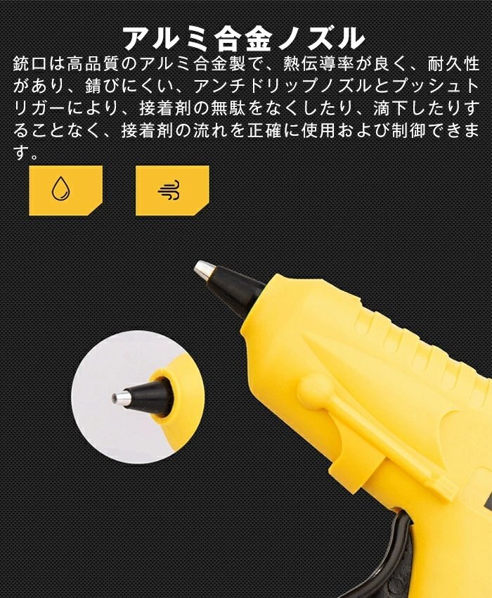 【アルミ合金ノズル】銃口は高品質のアルミ合金製で、熱伝導率が良く、耐久性があり、錆びにくい、アンチドリップノズルとプッシュトリガーにより、接着剤の無駄をなくしたり、滴下したりすることなく、接着剤の流れを正確に使用および制御できます。