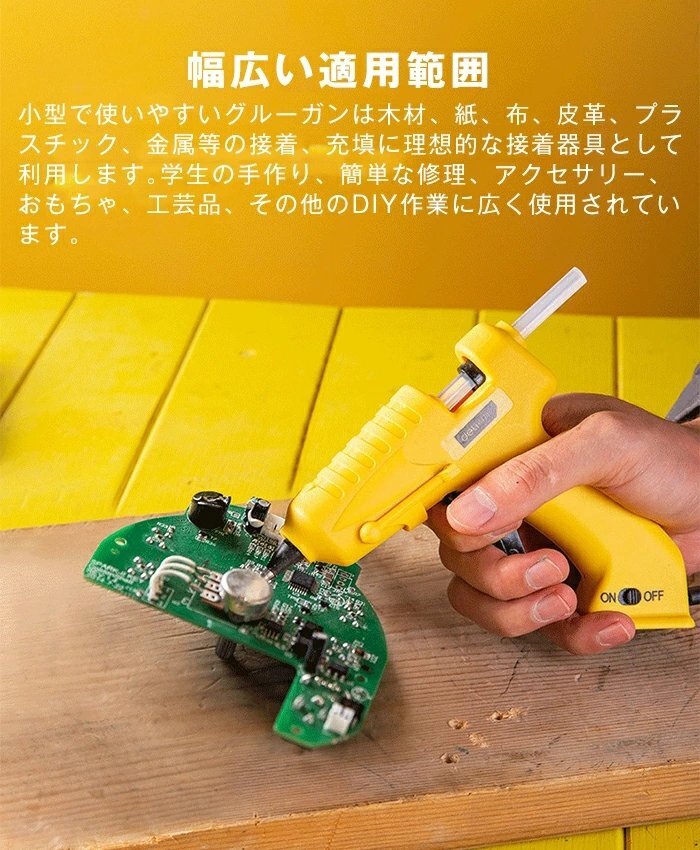 【幅広い適用範囲】小型で使いやすいグルーガンは木材、紙、布、皮革、プラスチック、金属等の接着、充填に理想的な接着器具として利用します。学生の手作り、簡単な修理、アクセサリー、おもちゃ、工芸品、その他のDIY作業に広く使用されています。
