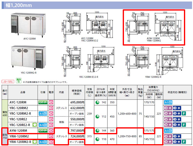 フクシマ 冷蔵コールドテーブル YRW-120RM2 を出品いたします。 ■特徴■ 進化し続ける省エネ技術 省エネ率約37% DCファンモーターの採用 庫内ファンと凝縮器ファンは高効率で ファンからの発熱量が少ない 省エネタイプのDCファンモーターを採用。 回転数制御を行うことで庫内の温度ムラを抑え、 さらに省エネを実現しました。 窓枠ヒーターの最適制御 窓枠ヒーターの通電率可変制御を 行う事で、省エネを図ります。 高効率蒸発器採用によりさらなる省エネ性向上 高効率内面溝付管採用により、 冷却面表面積が拡大。 さらなる省エネルギー化を実現。 見やすく設定しやすい温度コントロールパネル パネルを開かなくても、 そのまま温度設定ができます。 デザイン性と強度を兼ねそなえた 使いやすい新ハンドル ハンドル座にゴミが溜まりにくい形状。 上からでも下からでも握りやすいデザイン。 ハンドル一体形状により耐久性も向上。 ■仕様■